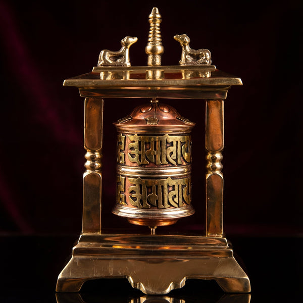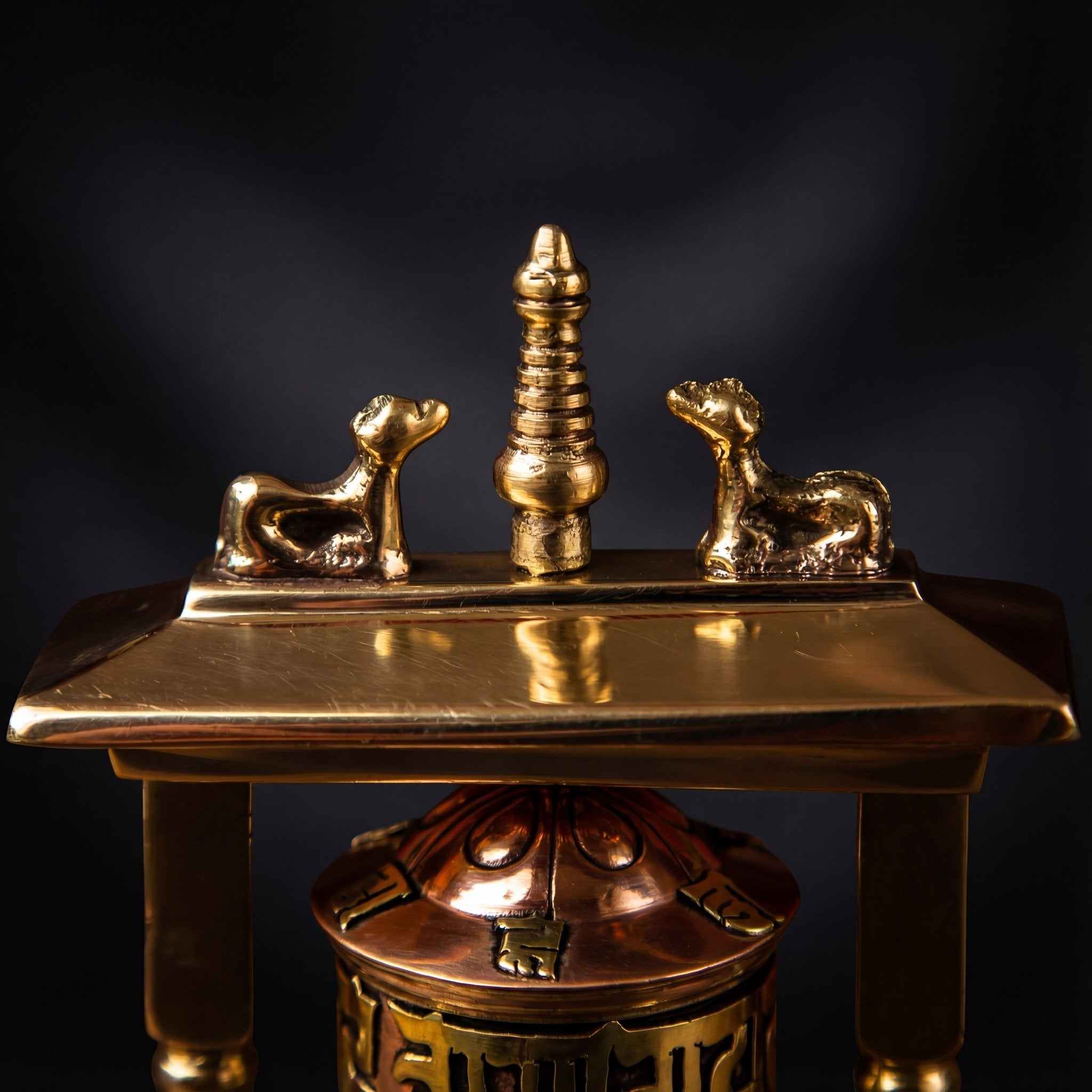 The top cover of the prayer wheel is adorned with two protective animals guarding the Gajura, further enhancing its spiritual significance. In Tibetan culture, prayer wheels serve as powerful tools for transforming negative energy into positive energy, and are thought to help accumulate merit and invoke compassion for all beings. By turning the wheel, practitioners are believed to spread blessings and spiritual peace.