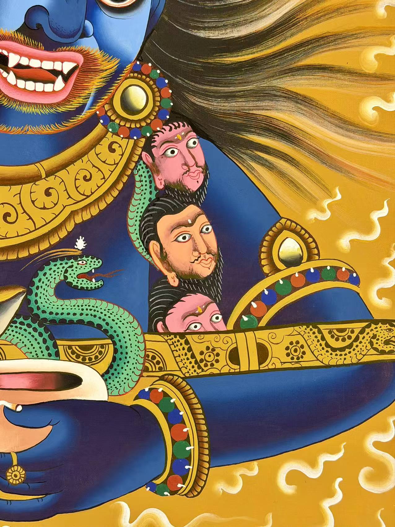 Mahakala, meaning "Great Time" in Sanskrit, is an essential deity in Vajrayana Buddhism. Known as Daheitian in Chinese and Daikokuten in Japanese, Mahakala is revered across all schools of Tibetan Buddhism. He is a powerful protector of the Dharma (Buddhist teachings) and a fierce embodiment of compassion, often regarded as an emanation of Avalokiteshvara (the Bodhisattva of Compassion) or Chakrasamvara (a deity symbolizing union and bliss).