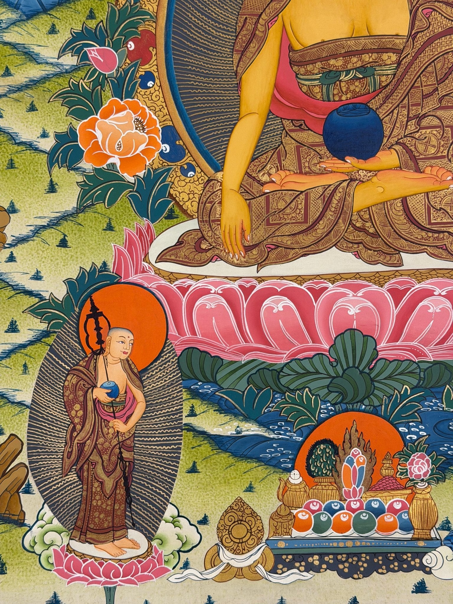Shakyamuni Buddha is traditionally painted in shades of gold or beige and depicted in monastic robes while seated atop a lotus throne. Symbolically, the lotus seat represents living in this world without being tainted by its imperfections. The sun and moon are placed on the lotus to symbolize prajna (wisdom) and upaya (compassionate means) respectively.