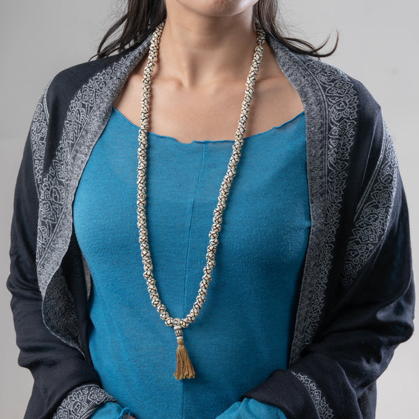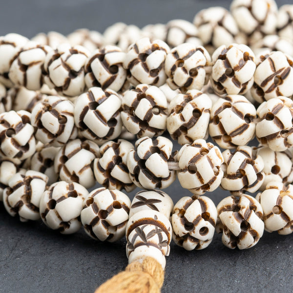 This antique-style mala is created from naturally dyed yak bone beads that are handcrafted by skilled artisans in the Himalayas. In this region, large animals such as yaks and water buffalo are utilized for various purposes, including food, clothing, and spiritual items. Due to the limited resources in the area and the deep-rooted religious practices, there is a strong emphasis on ensuring that nothing goes to waste. The artisans recycle and reuse everything in daily life, integrating these practices into their spiritual rituals and craftsmanship.