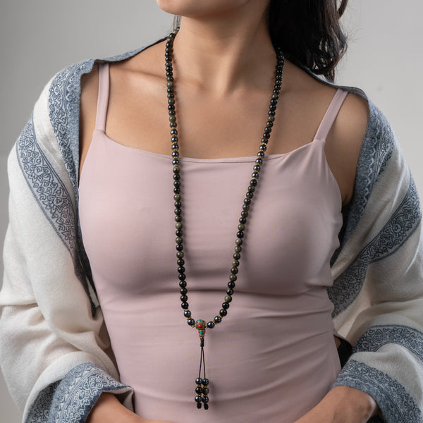 This mala features powerful Hematite and Obsidian beads, two stones known for their protective and grounding properties. Hematite, rich in iron, clears negative energy, enhances memory, and keeps you grounded, while Obsidian shields against negativity, helping to dissolve emotional blockages. Together, these stones support spiritual growth, provide a sense of safety, and encourage emotional harmony.