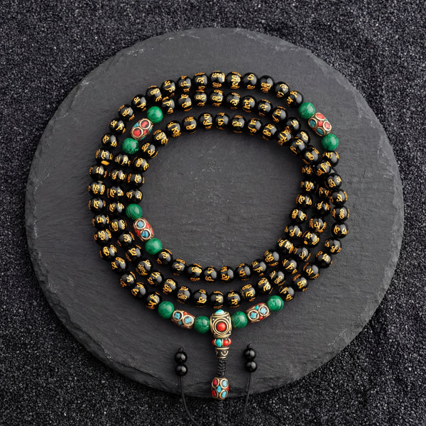 This black onyx mala is hand-carved with the powerful mantra Om Mani Padme Hum, representing the essence of Buddhist teachings. Onyx is known for stabilizing and strengthening the Root Chakra, promoting grounding and productivity. As a soothing stone, it helps alleviate fears and worries, while also providing strength and confidence. The lustrous black onyx shields you from negative energy.