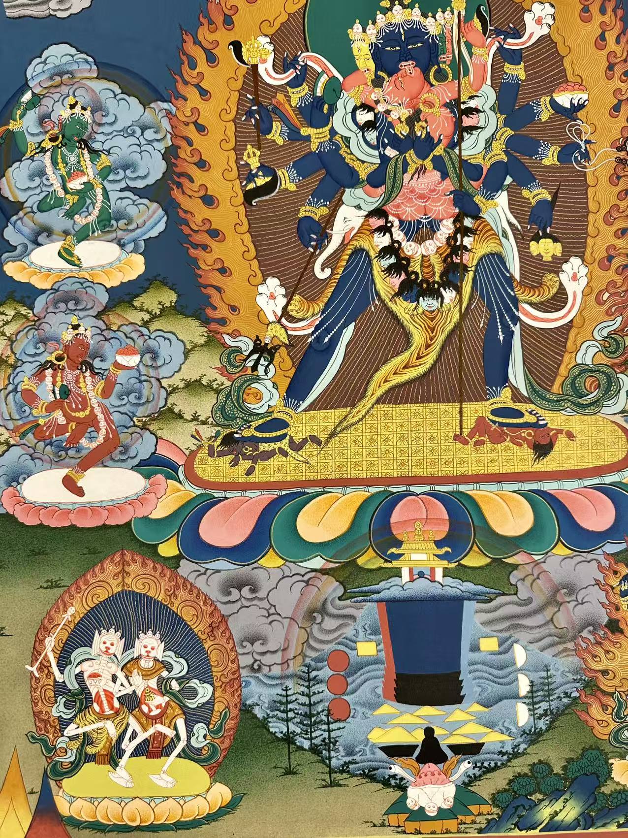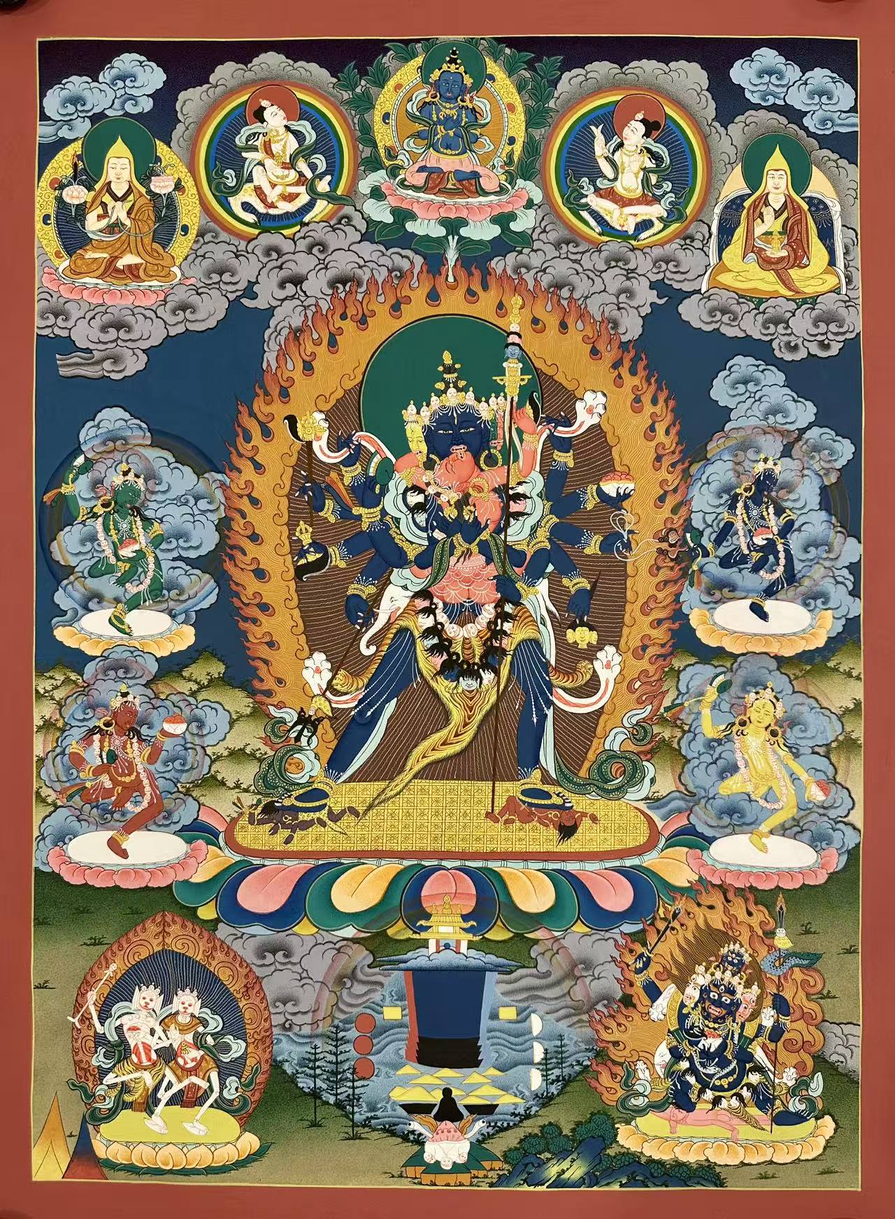 The deity is accompanied by Vajravarahi, his red consort, who embraces him in a dance of divine union. She holds a blood-filled skullcup in one hand and a curved knife in the other, symbolizing the transformative power of wisdom and compassion. Together, they are surrounded by a blazing fire of pristine awareness, representing the transformative power of their union.