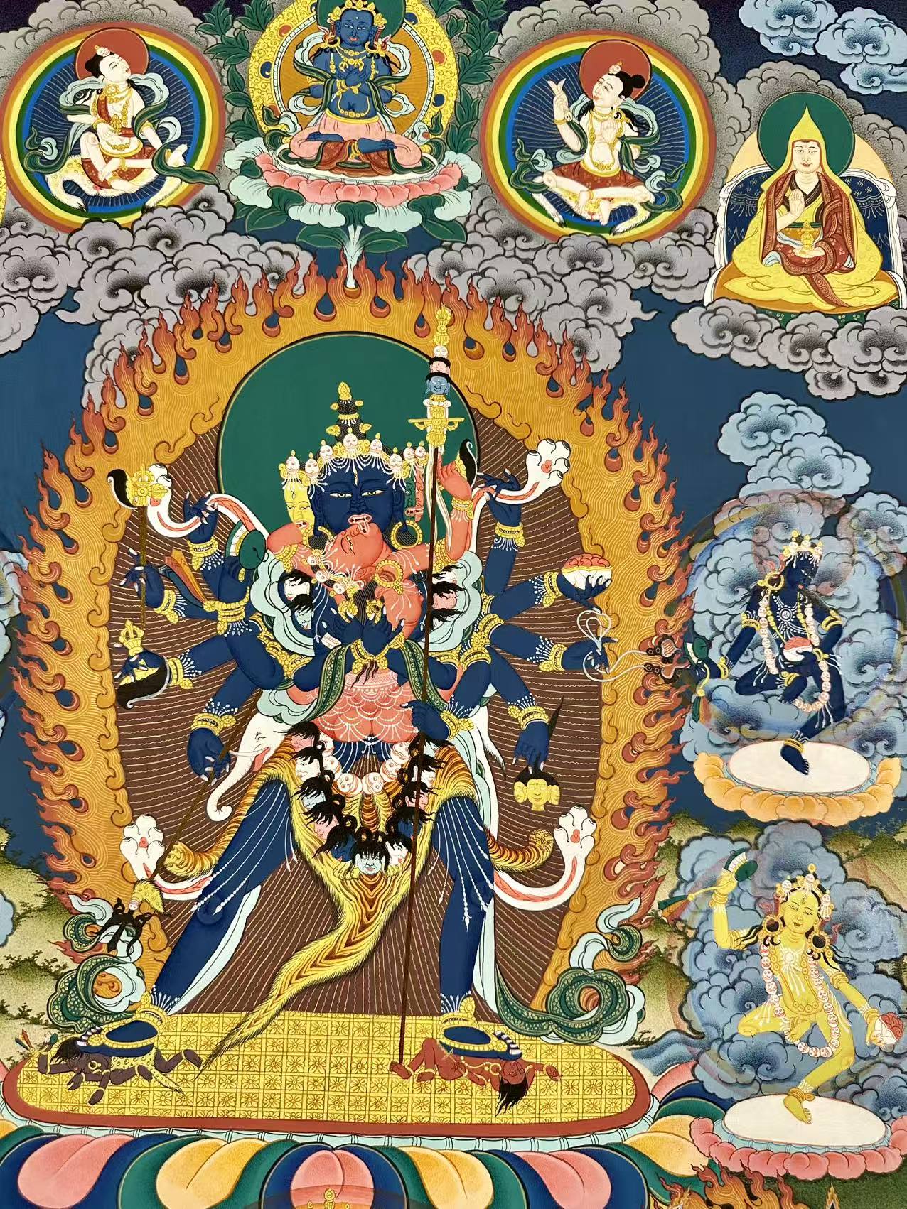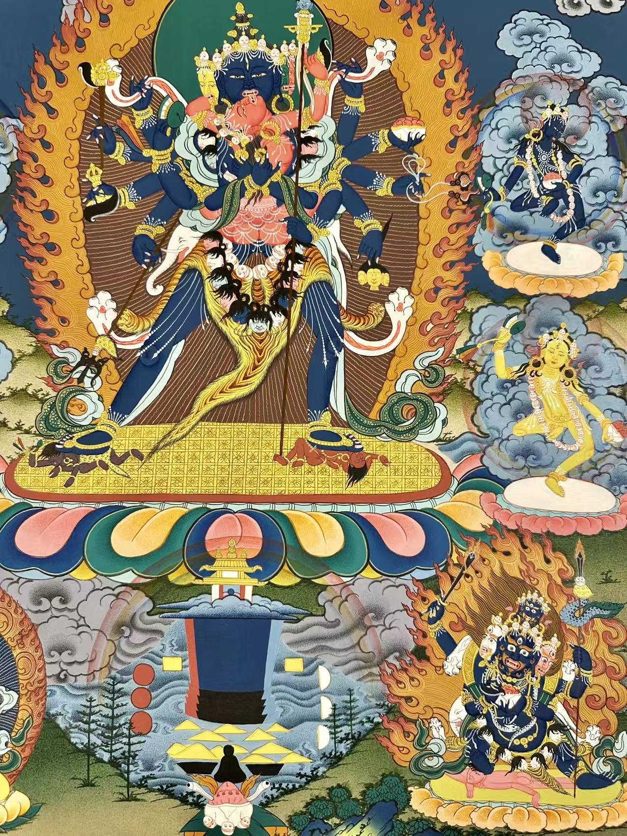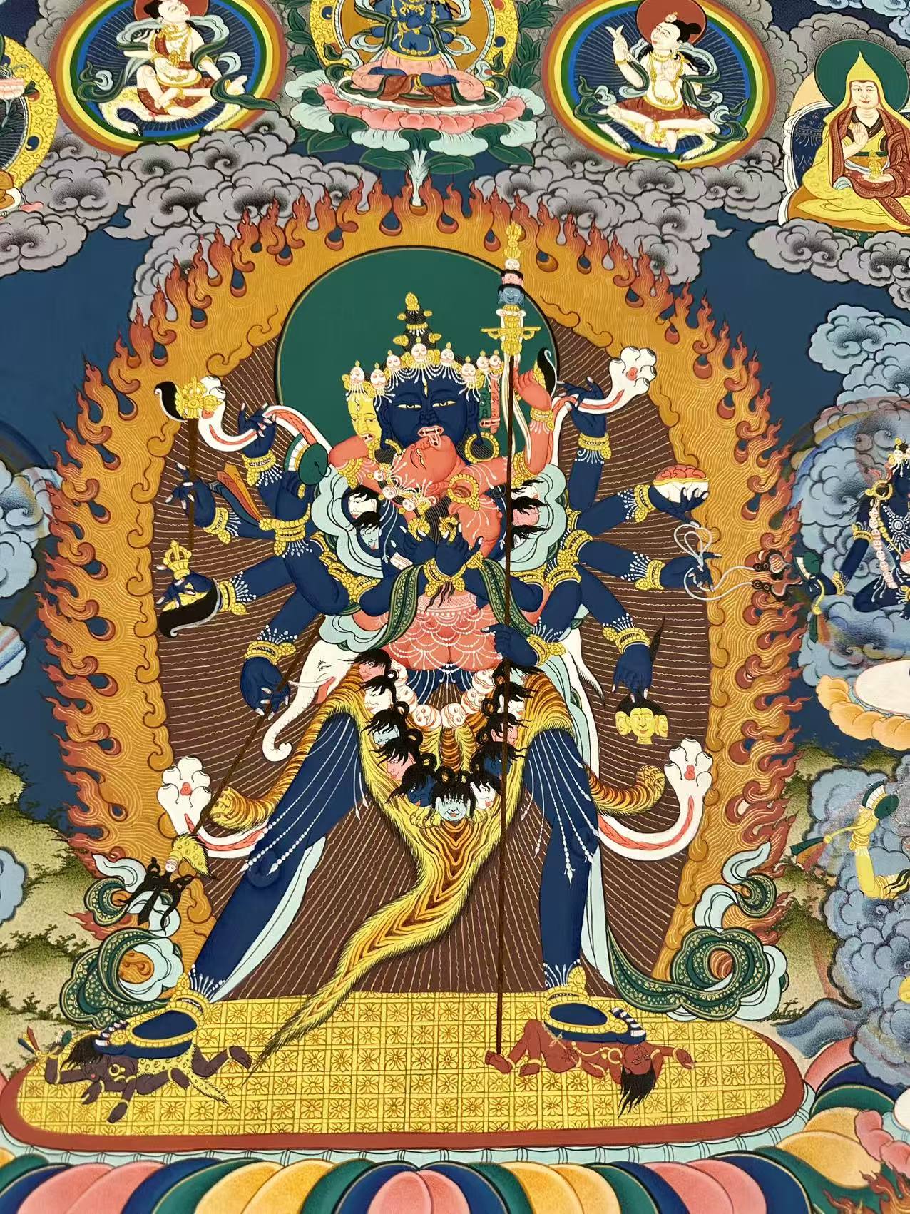The Thangka depicts Shri Chakrasamvara, a blue deity with four faces (blue, red, yellow, and white) and twelve hands. Each face is adorned with three eyes and bared fangs, symbolizing his profound wisdom and power. Chakrasamvara’s posture is dynamic, as he presses his right leg on the breast of Kalaratri, a fierce red deity, and his left leg on the head of Yama, the lord of death.