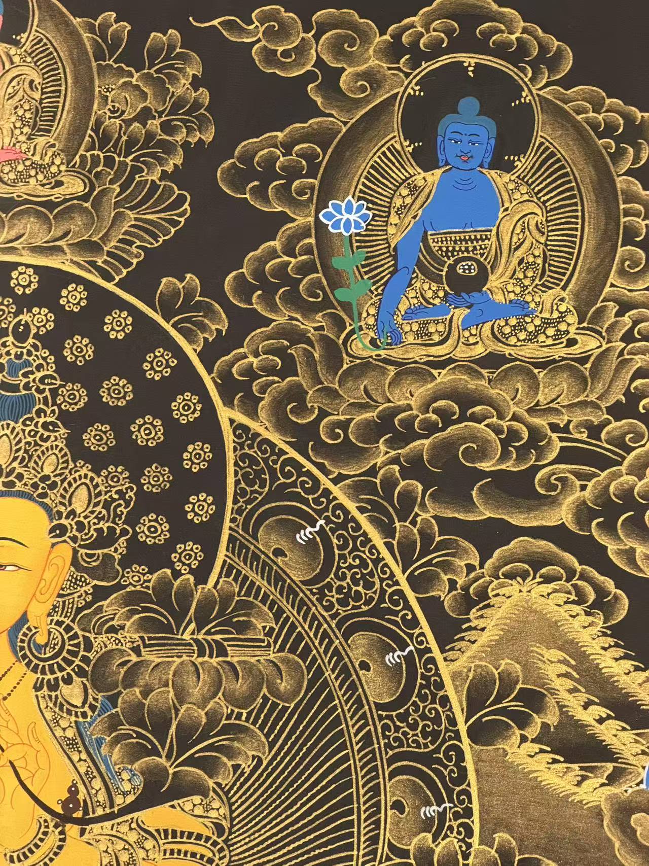 Thangka paintings are painted using natural minerals such as agate, gold, silver, cinnabar, saffron, ocher, rhubarb,lapis and many other minerals. To create the ideal pigment for painting, these materials are ground several times. This makes the materials even more durable and long-lasting. Thus, you can surely expect the color of the Thangka to withstand the test of time.