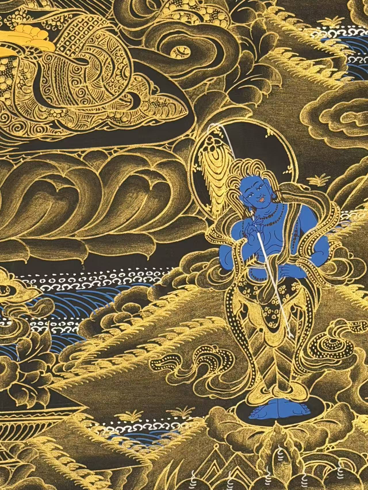 In this Thangka, Manjushri's golden skin radiates multi-colored rays, symbolizing the many paths through which he leads others to wisdom. The sword in his right hand represents the knowledge that cuts through ignorance, clearing the minds of unenlightened beings. In his left hand, he holds a sutra, representing the sacred teachings that instill wisdom and ignite the journey toward omniscience.