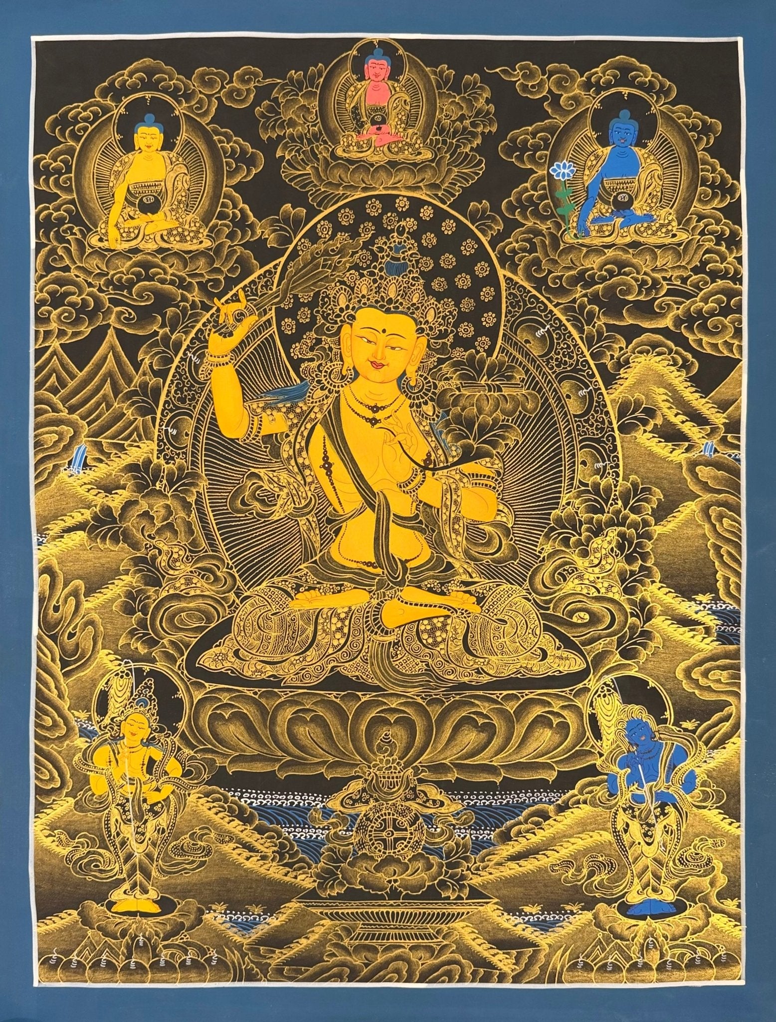 Manjushri’s image serves as a constant reminder to cultivate wisdom and enlightenment. Displaying this Thangka invites the qualities of knowledge and purity into your life, inspiring spiritual growth and clarity.