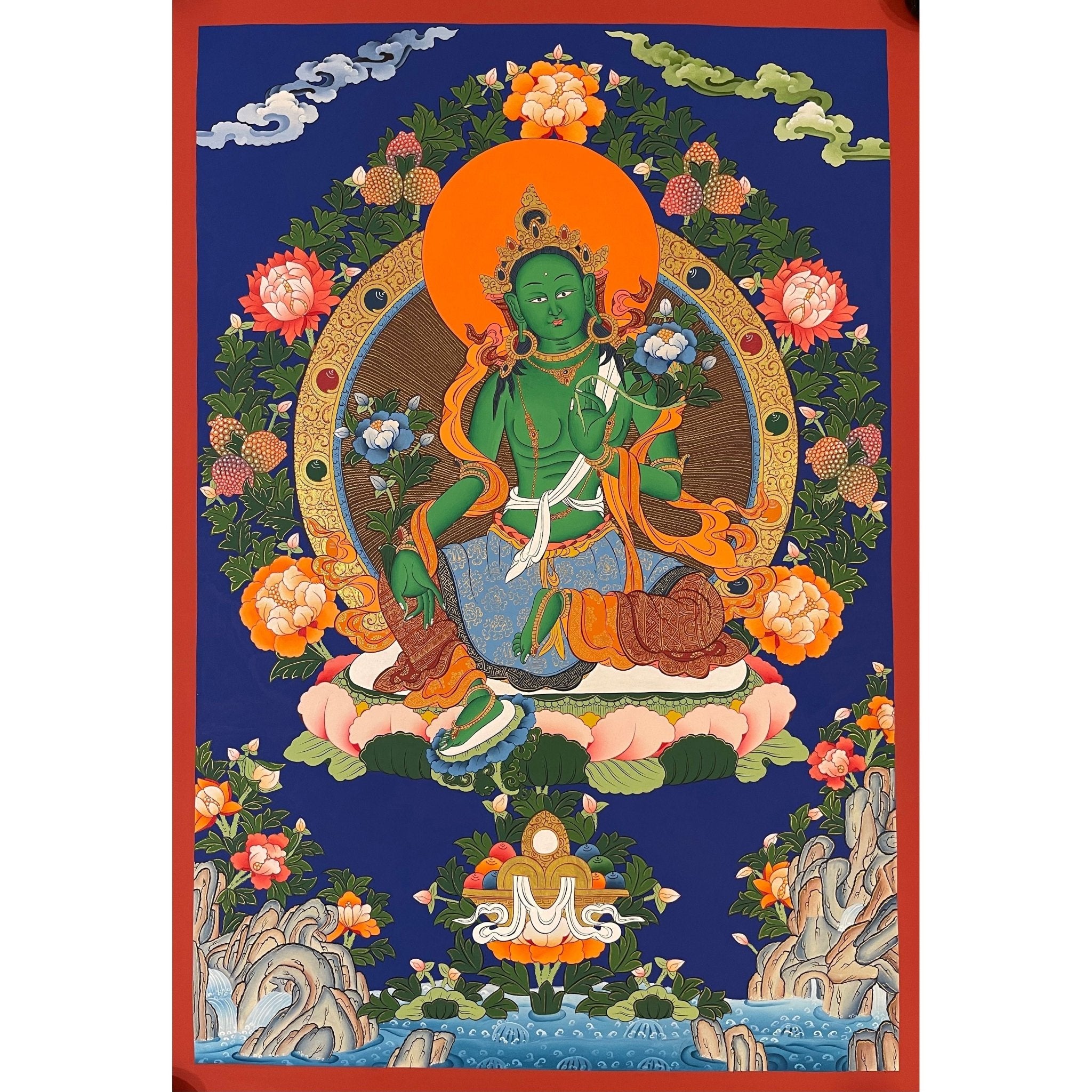 About Green Tara Thangka Art This Thangka painting depicts Green Tara, a Buddhist deity associated with enlightened activity and abundance. Often viewed as a Bodhisattva or Buddha of compassion and action, Green Tara is a protector who comes to one's aid to relieve physical, emotional, and spiritual suffering. In Buddhism, her name, Tara, means "She Who Leads Across," referring to her role in guiding humanity from Samsara, the Ocean of Illusion, towards liberation.