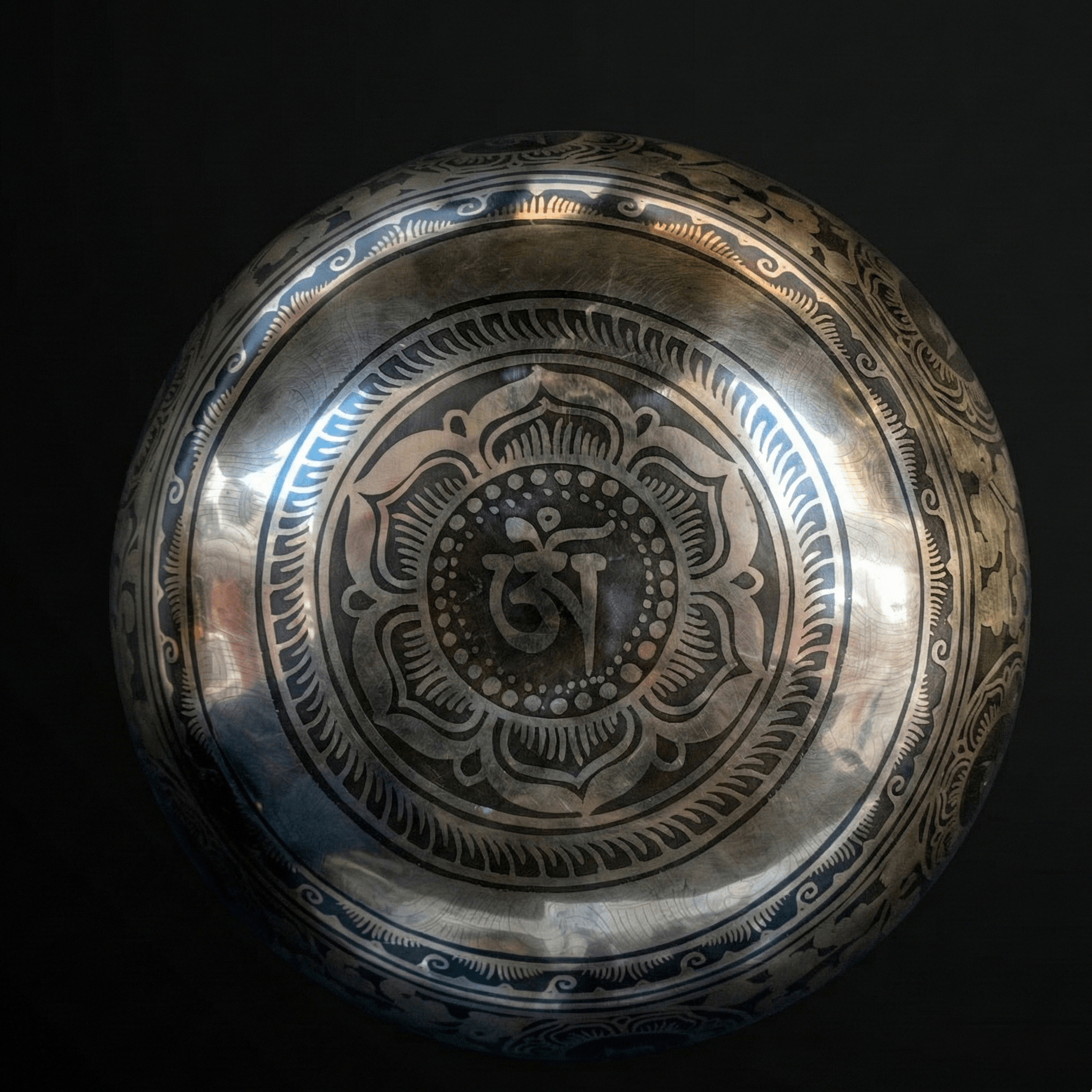 The base of the bowl is adorned with the Om symbol, regarded as the primordial sound from which the universe originated. It represents the unity of all existence and serves as a grounding tool for meditation, connecting the practitioner to a deeper spiritual realm.