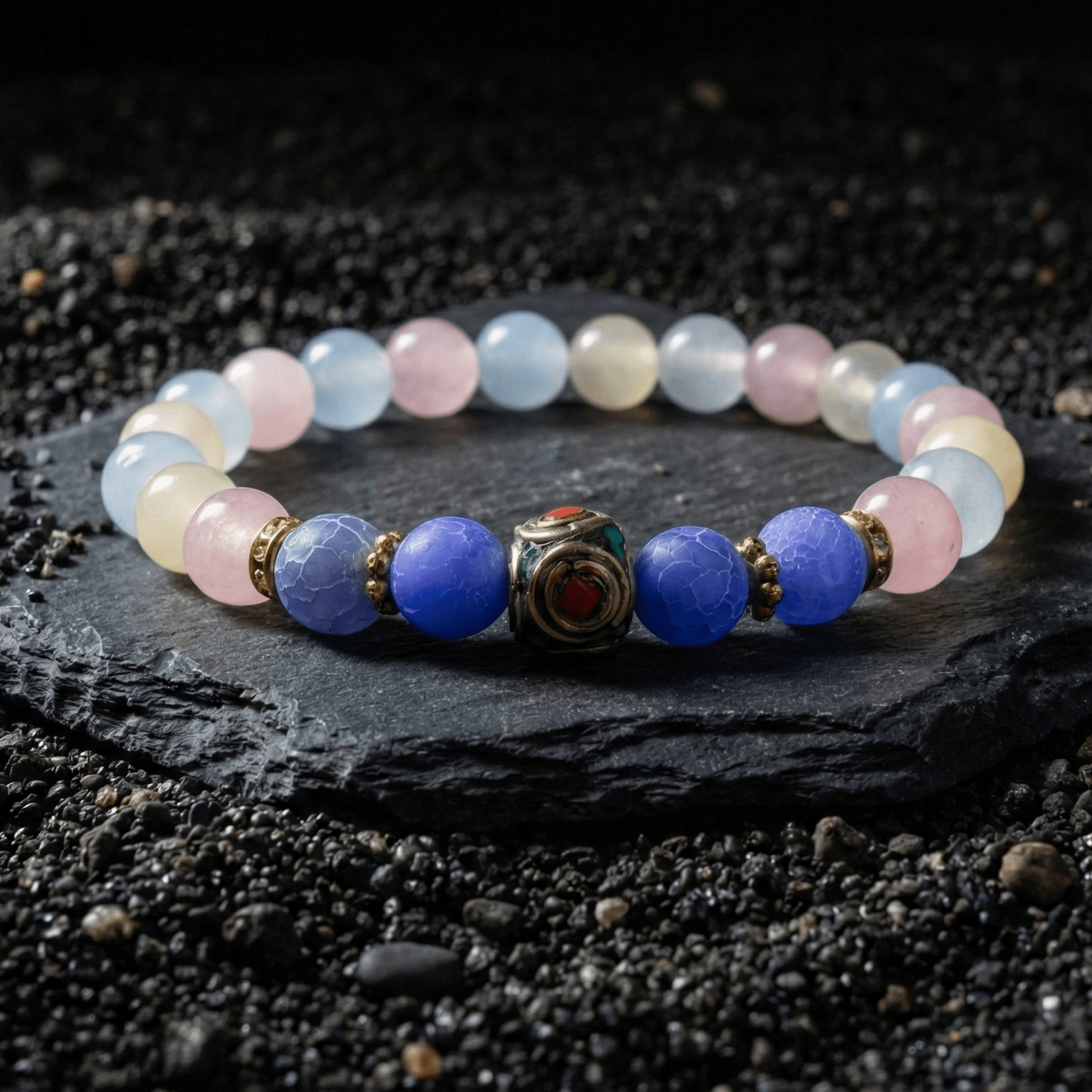 This combination of Chalcedony and Dragon Vein Agate is perfect for those seeking peace, creativity, and emotional harmony. Wear it alone for a simple statement or stack it with your favorite bracelets and malas.