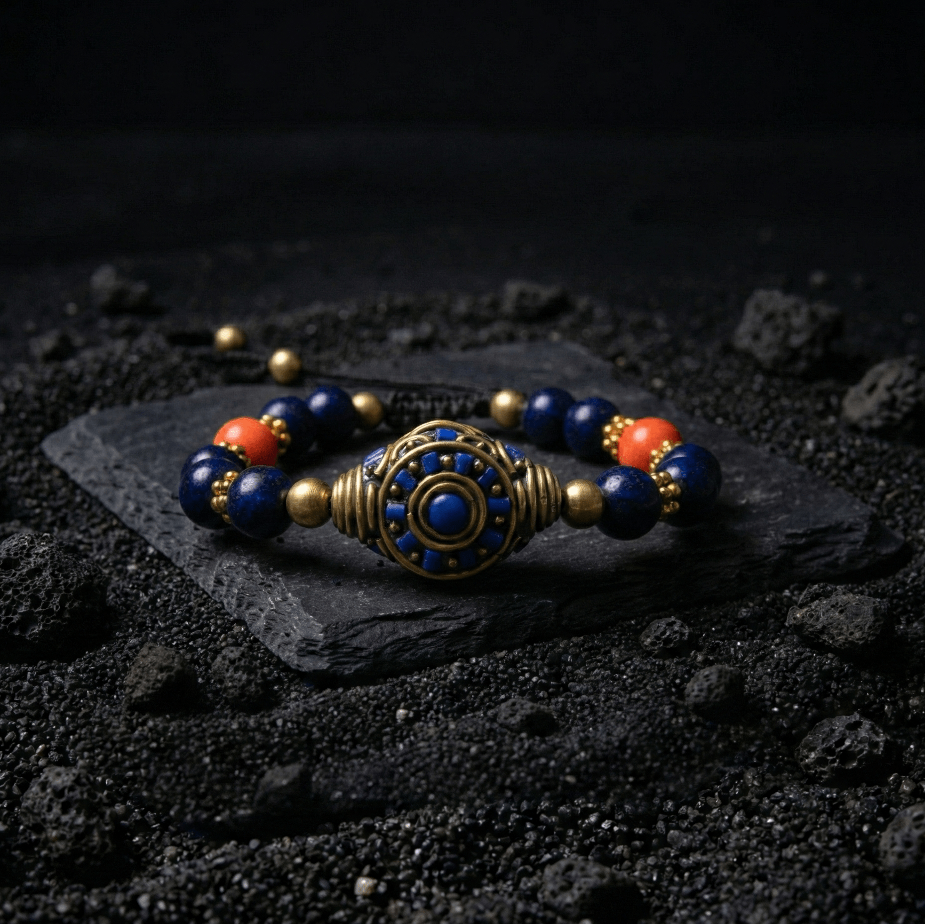 <li>Hand carved beautiful lapis and coral inlaid dharma chakra charm</li>