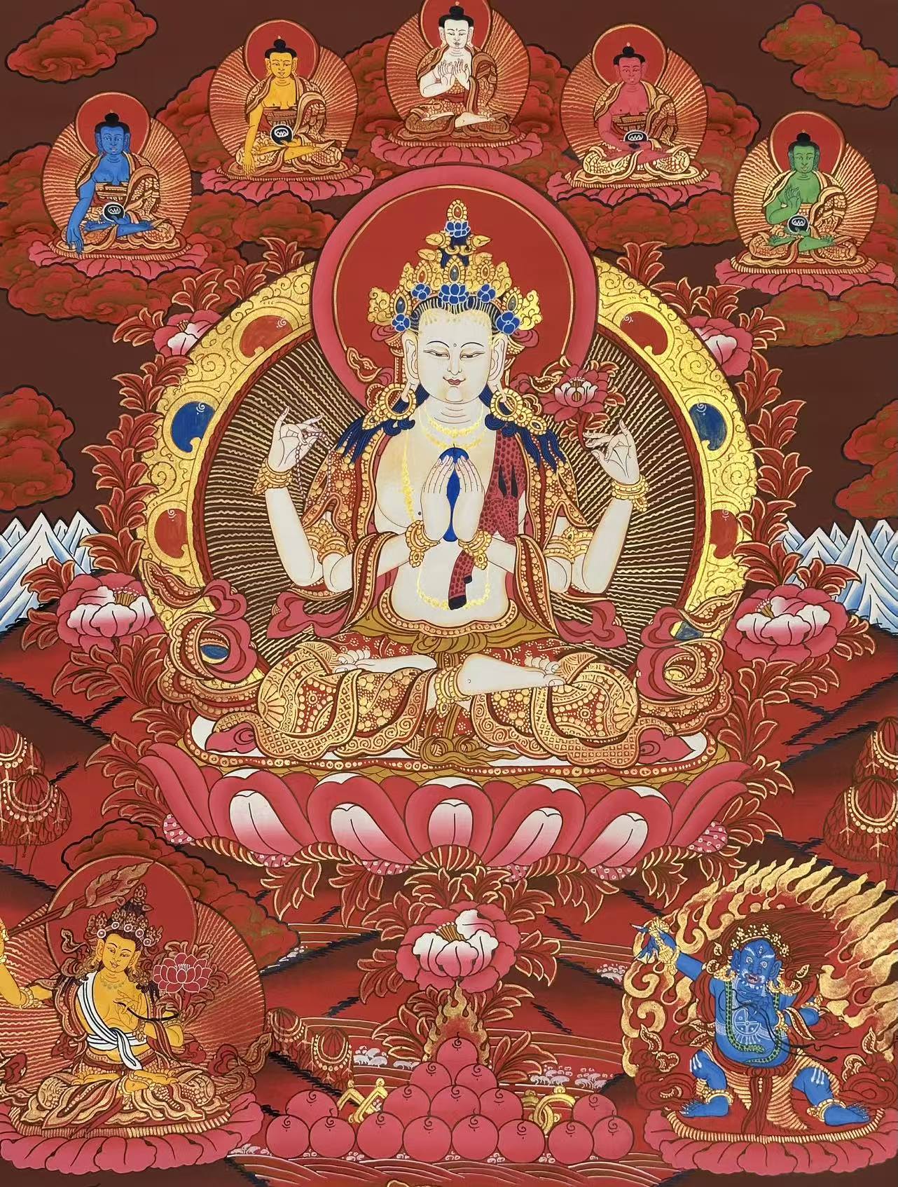 Symbol of Compassion: Chenrezig’s depiction emphasizes the boundless compassion for all living beings, offering a reminder to practice kindness and empathy.