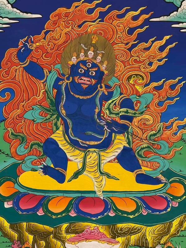 The dark blue hue of Vajrapani reflects his eternal connection to the Truth Body (Dharmakaya), representing the ultimate blissful state of enlightenment. Despite his wrathful appearance, his purpose is compassionate—protecting the teachings and upholding the Buddha's Dharma from those who wish to destroy it.