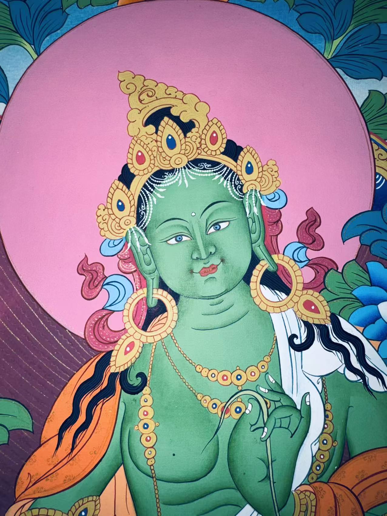 Cultural and Religious Depth: A meaningful portrayal of Green Tara, symbolizing her active compassion and protection.