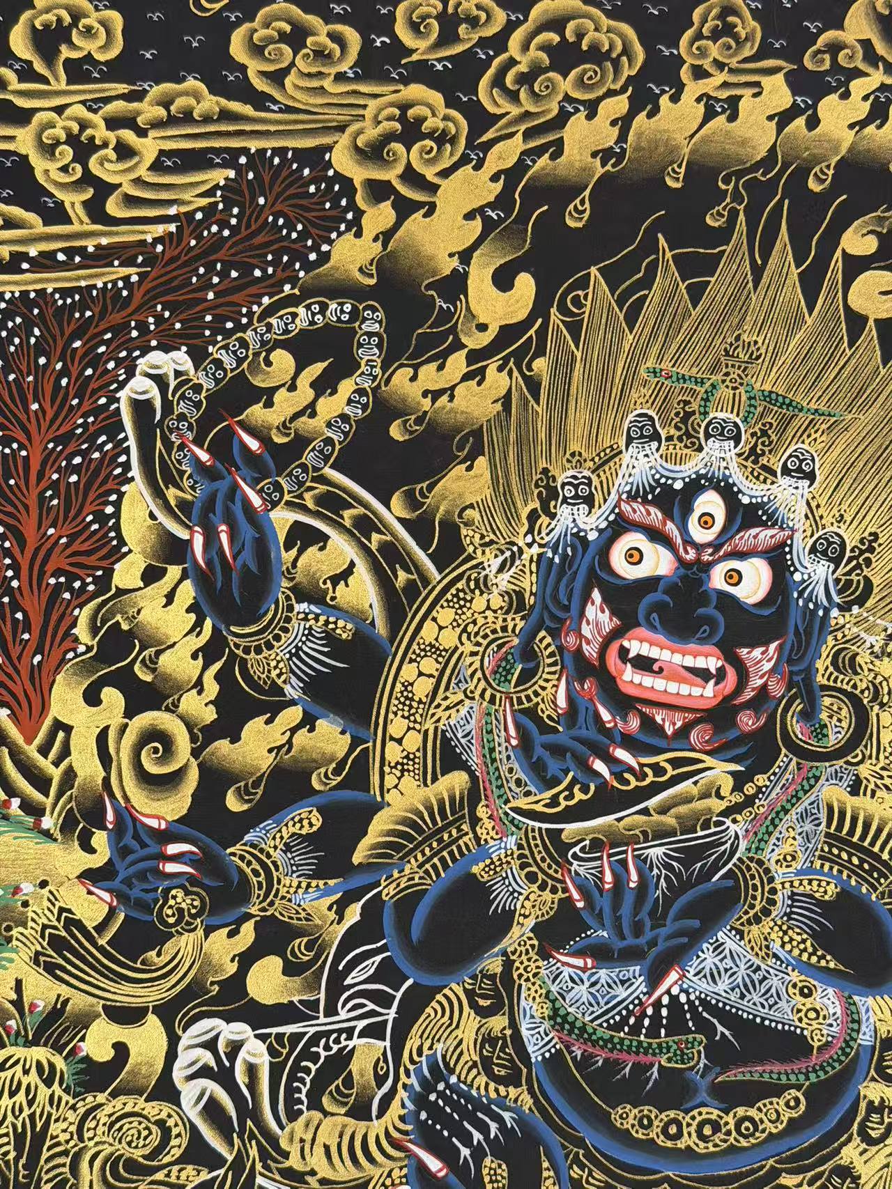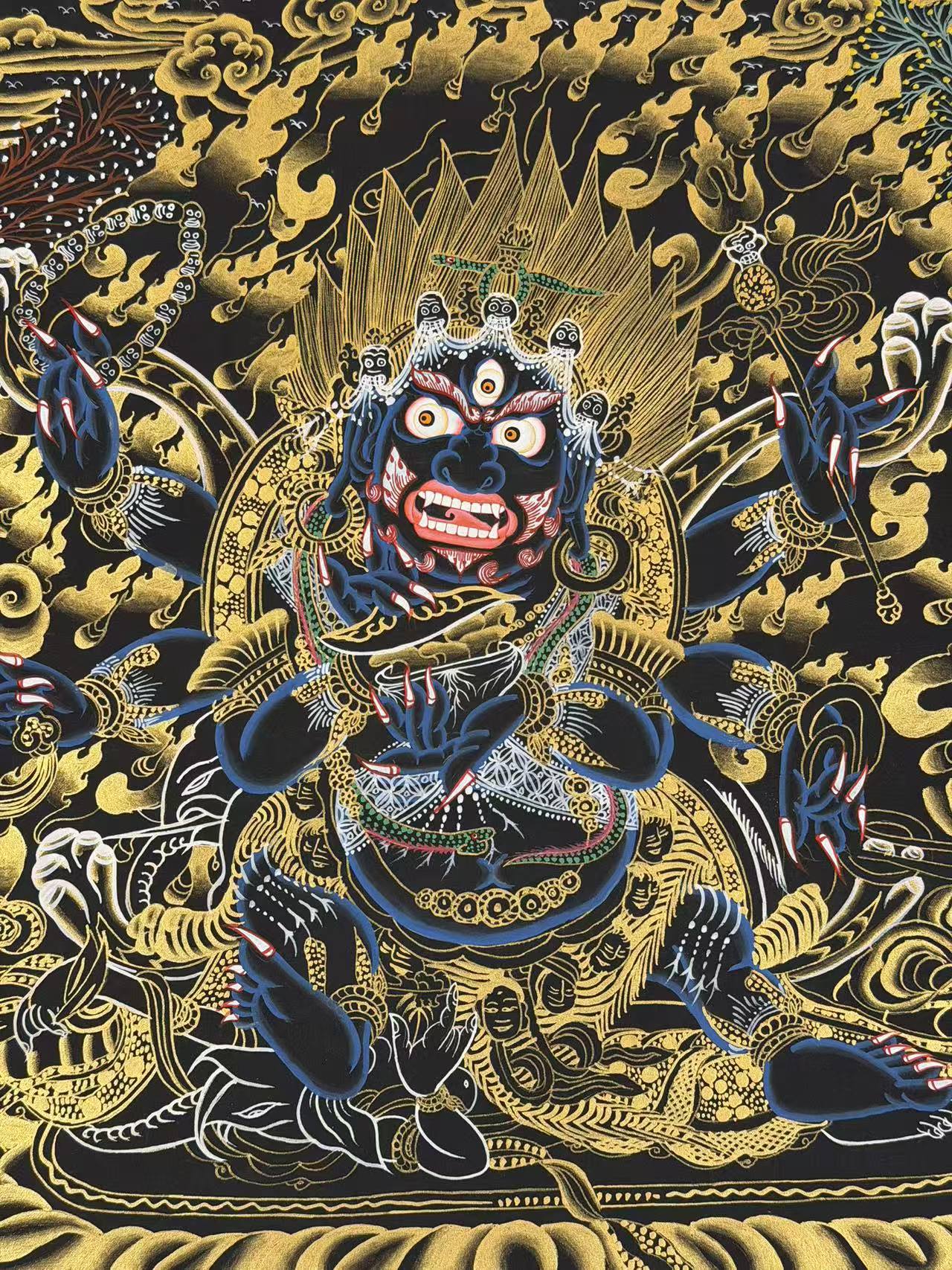 Mahakala, meaning "Great Time" in Sanskrit, is a central figure in Vajrayana Buddhism and is also venerated in Chinese and Japanese Buddhism. Known as Daheitian in Chinese and Daikokuten in Japanese, Mahakala is one of the most revered Dharmapalas. His role is to protect the Dharma and safeguard the teachings of the Buddha.