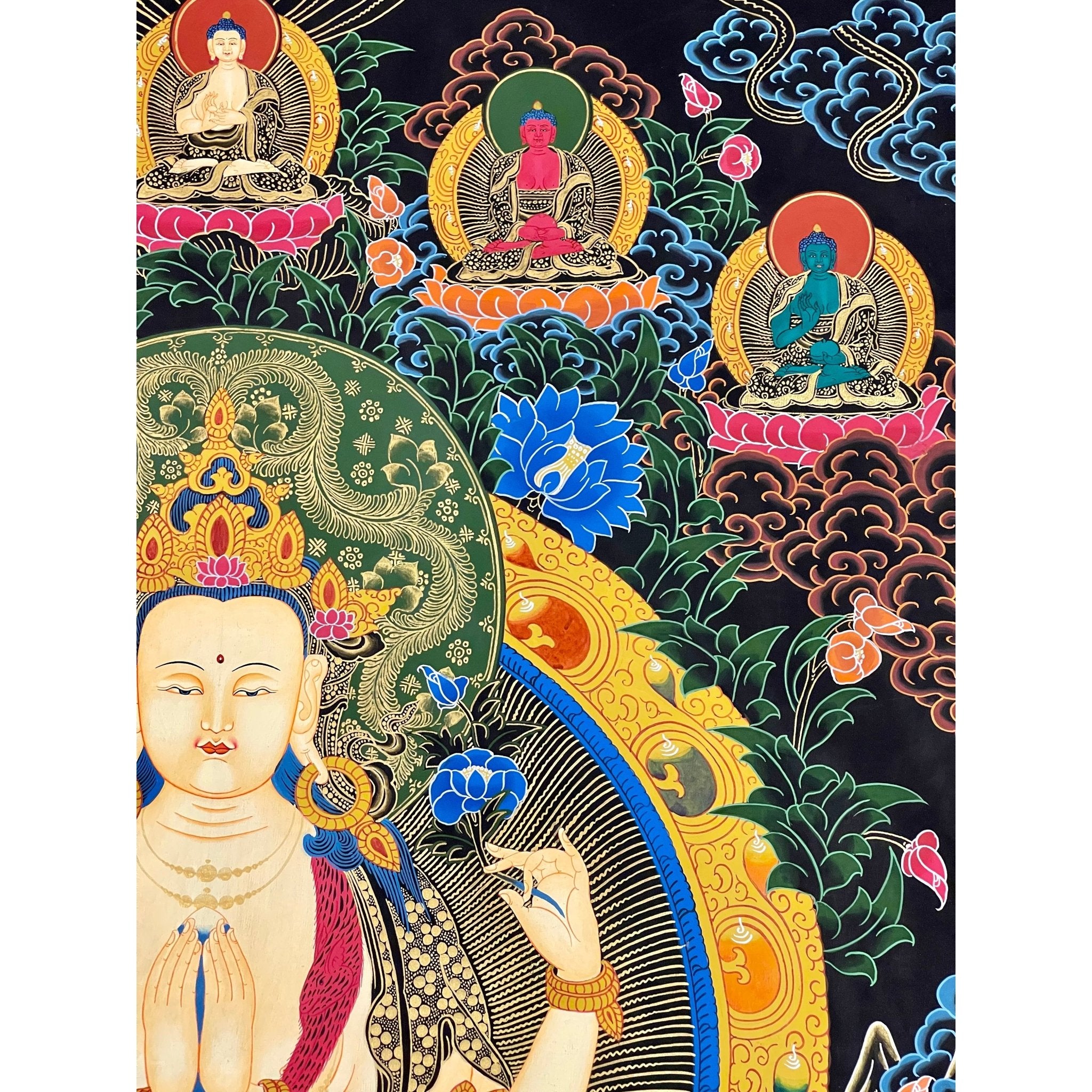 This 100% hand-drawn Chenrezig Thangka is an exquisite representation of the Bodhisattva of Compassion. Made in the Kathmandu Valley, Nepal, this Thangka not only serves as an elegant decoration but also brings profound spiritual energy to any space. It can be displayed as a focal point in your home or office or placed on your family altar for meditation, attracting the benevolent energy of Tibetan Buddhist art.