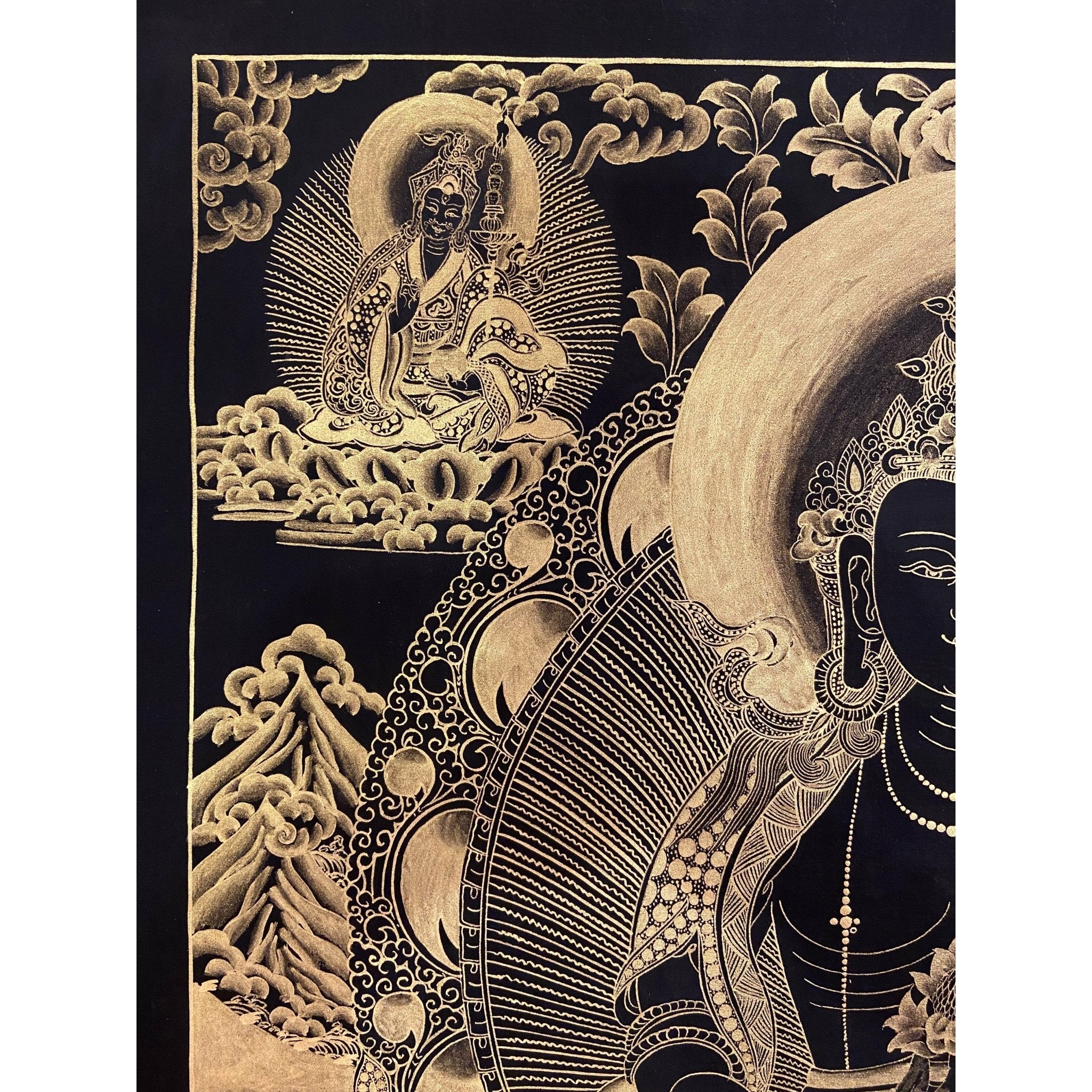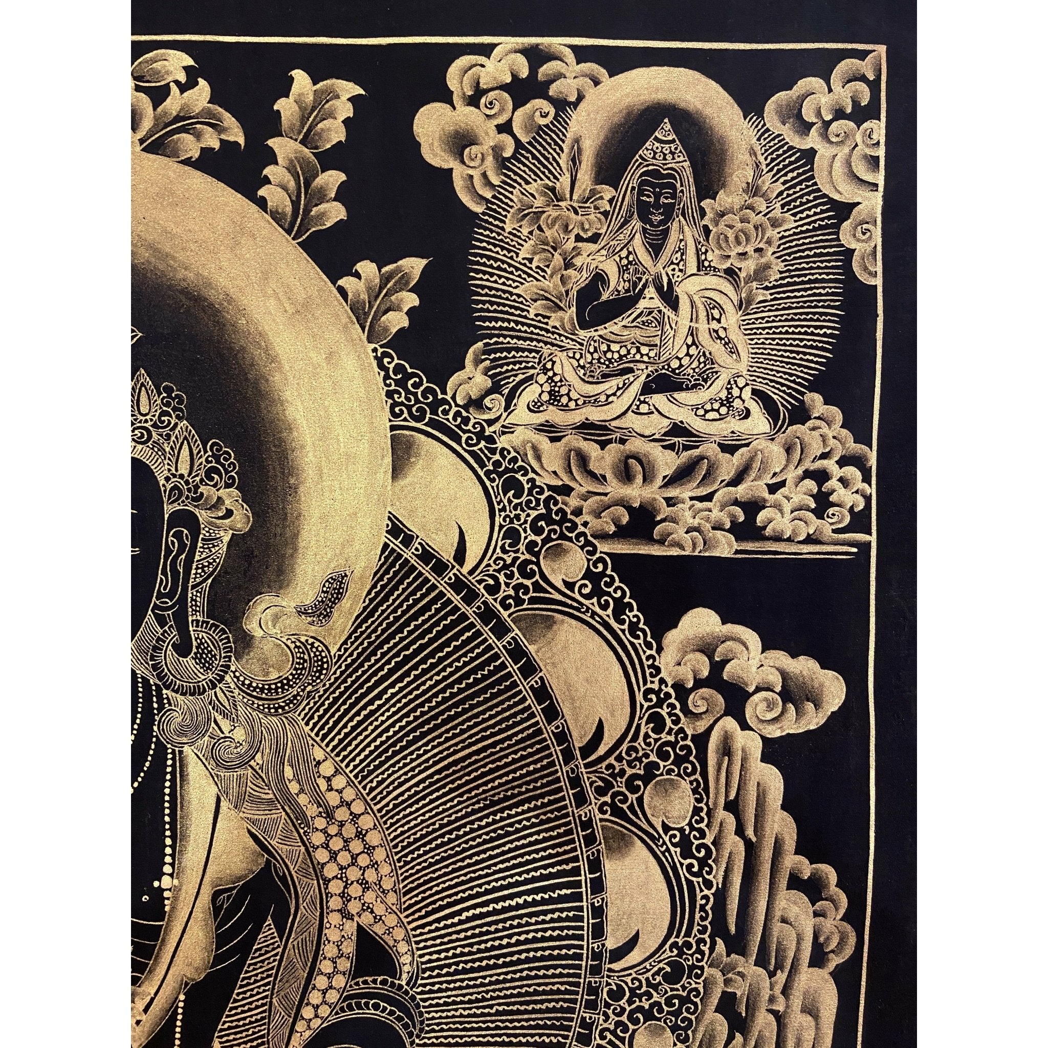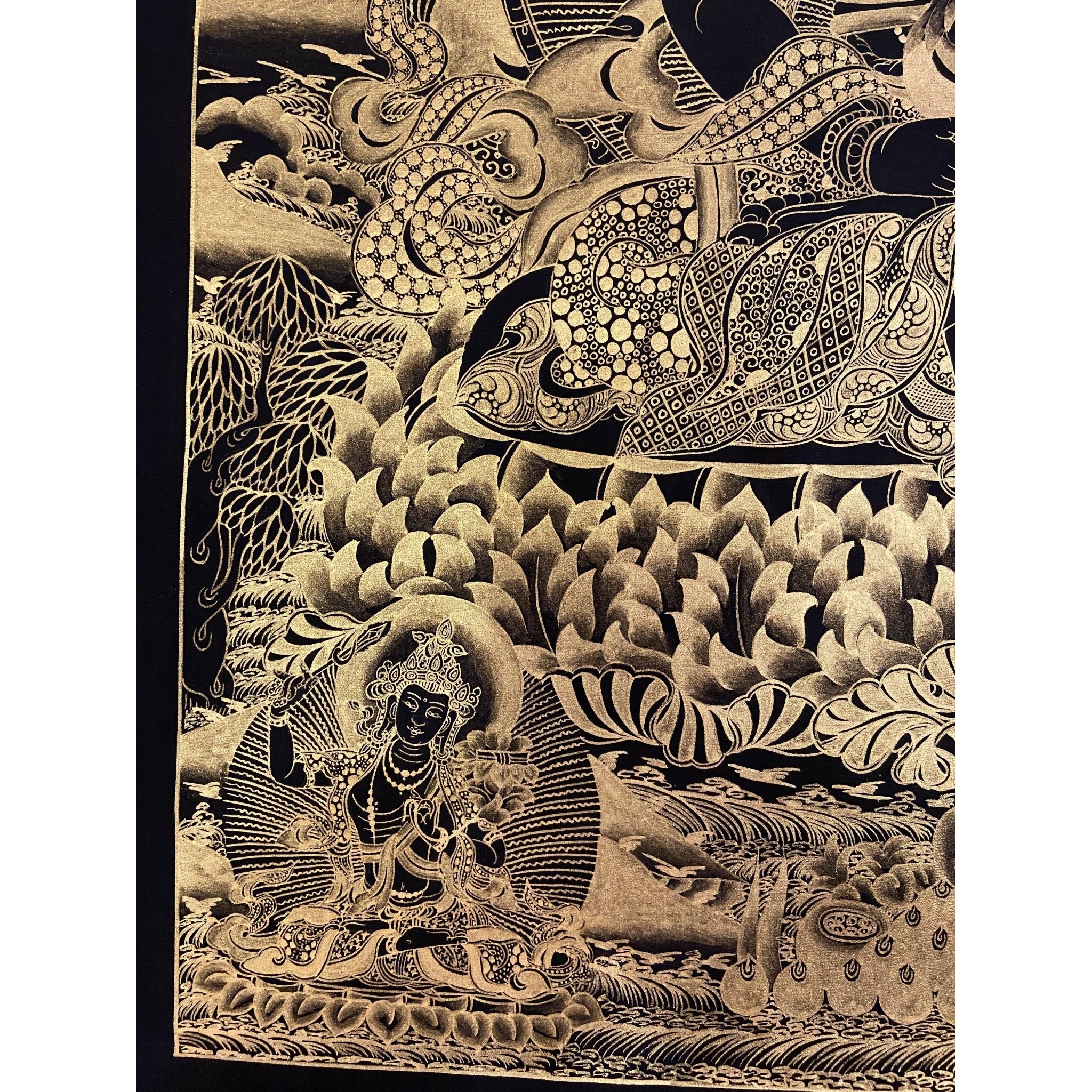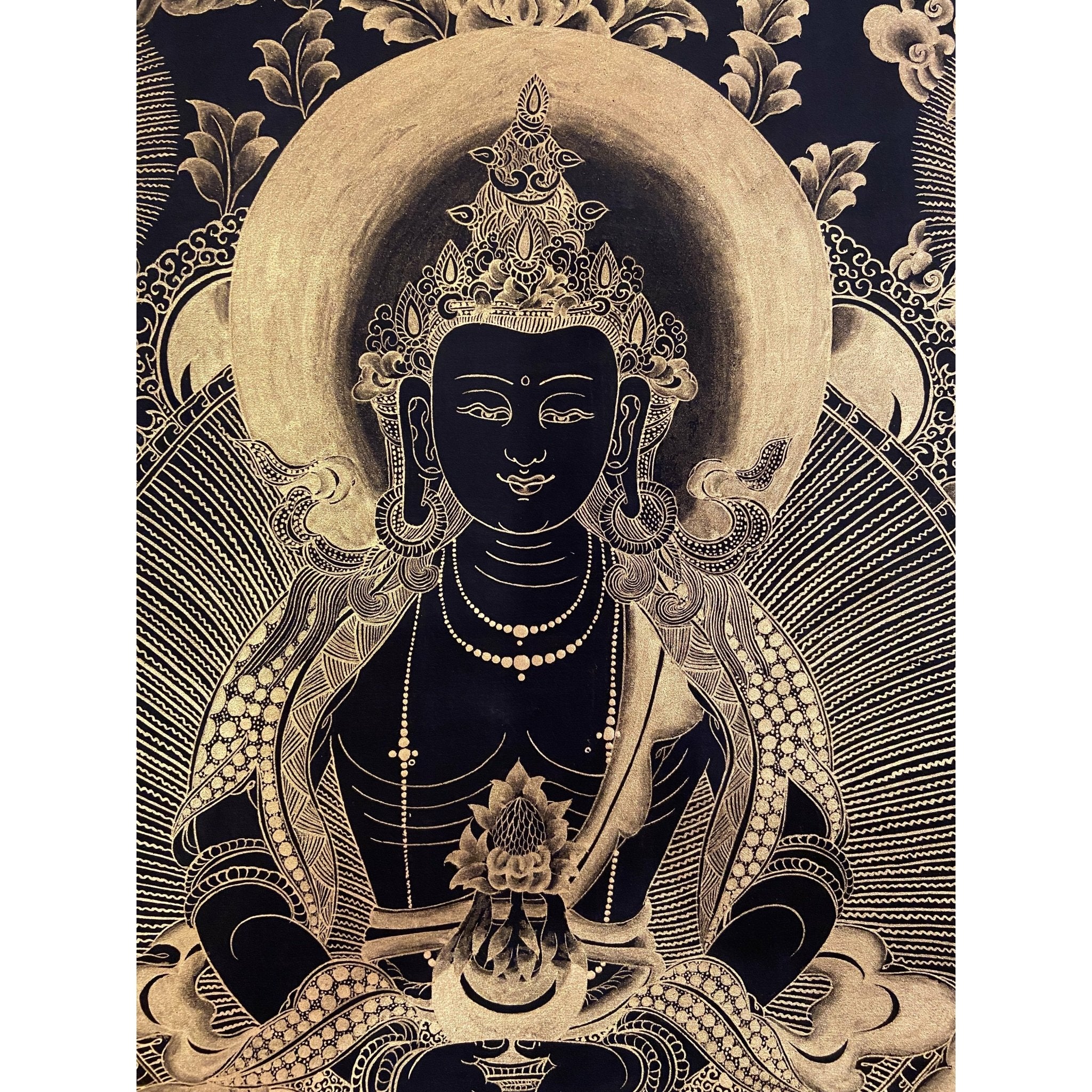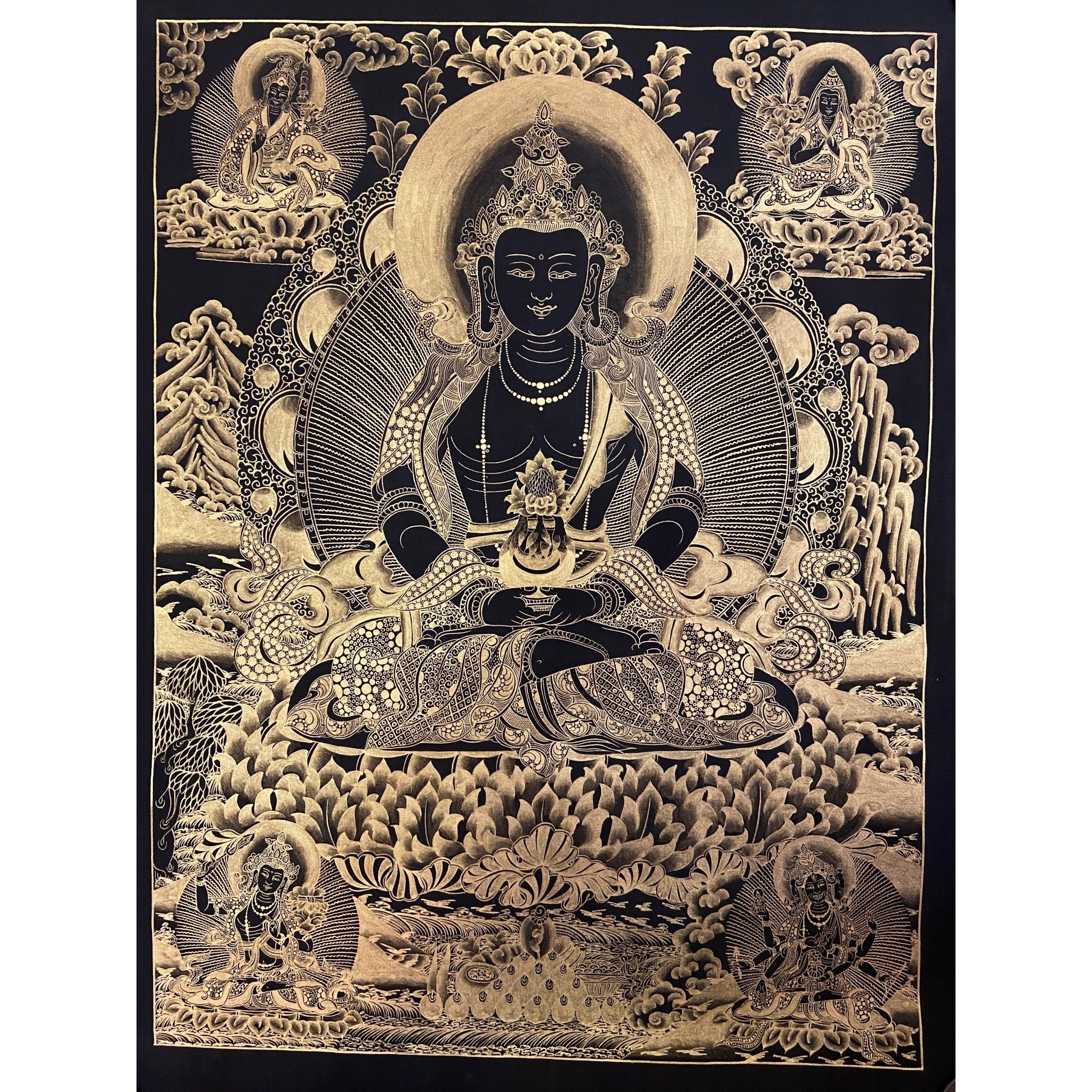 This 100% hand-drawn Tibetan Thangka painting depicting Amitayus Buddha is the perfect way to elevate your home décor. Crafted in Nepal, it is ideal for transforming your living room, office, or family altar into a serene, spiritually rich environment. As a centerpiece, it draws attention and attracts positive energy, aiding in meditation and emotional healing.