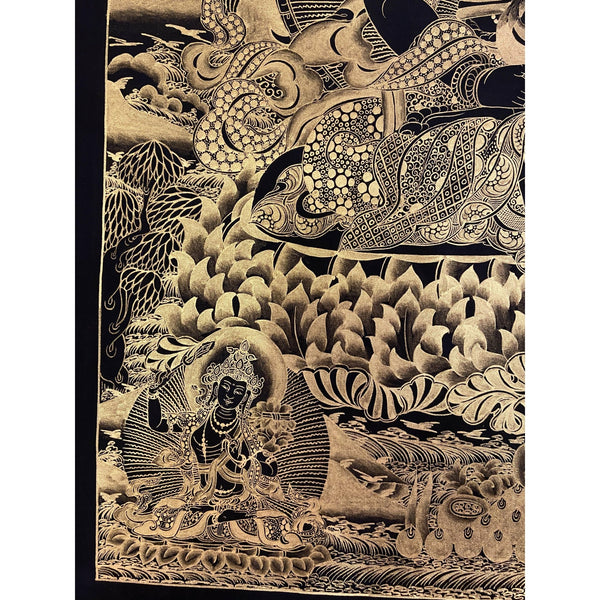 Thangka paintings are painted using natural minerals such as agate, gold, silver, cinnabar, saffron, ocher, rhubarb,lapis and many other minerals. To create the ideal pigment for painting, these materials are ground several times. This makes the materials even more durable and long-lasting. Thus, you can surely expect the color of the Thangka to withstand the test of time.