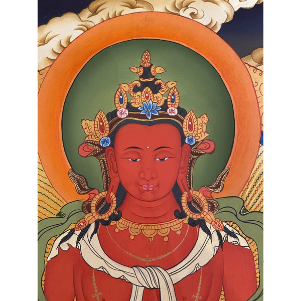 This finely crafted Tibetan Thangka depicts Amitayus Buddha, revered as the Buddha of Eternal Life. The Thangka represents his ability to bless practitioners with longevity, wisdom, and a path to spiritual liberation. Hand-painted with 24 Carat Gold and Tibetan natural colors, this beautiful artwork is the ideal piece to enhance your meditation practice or home décor.