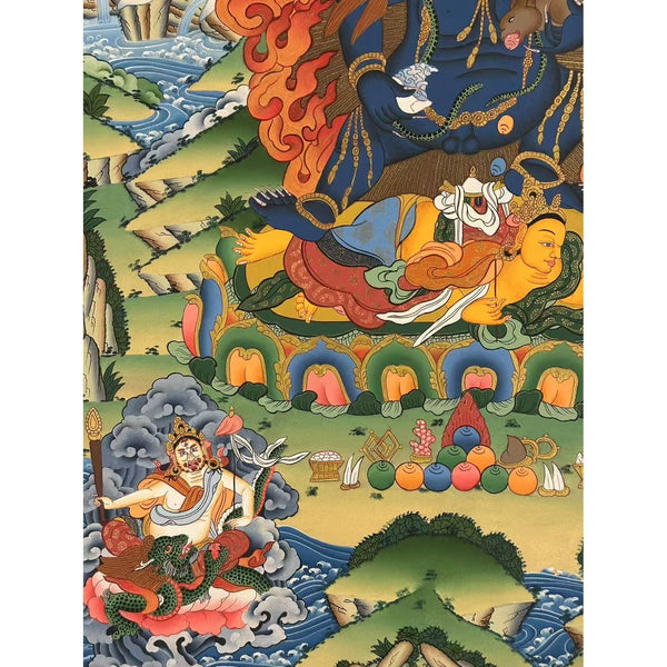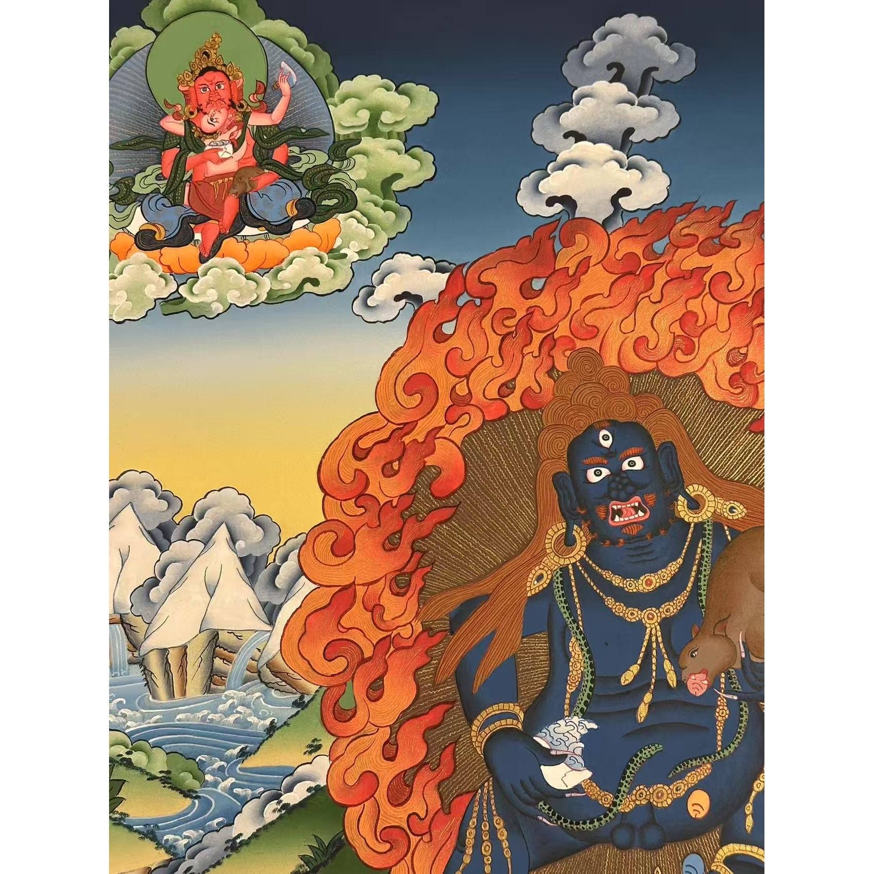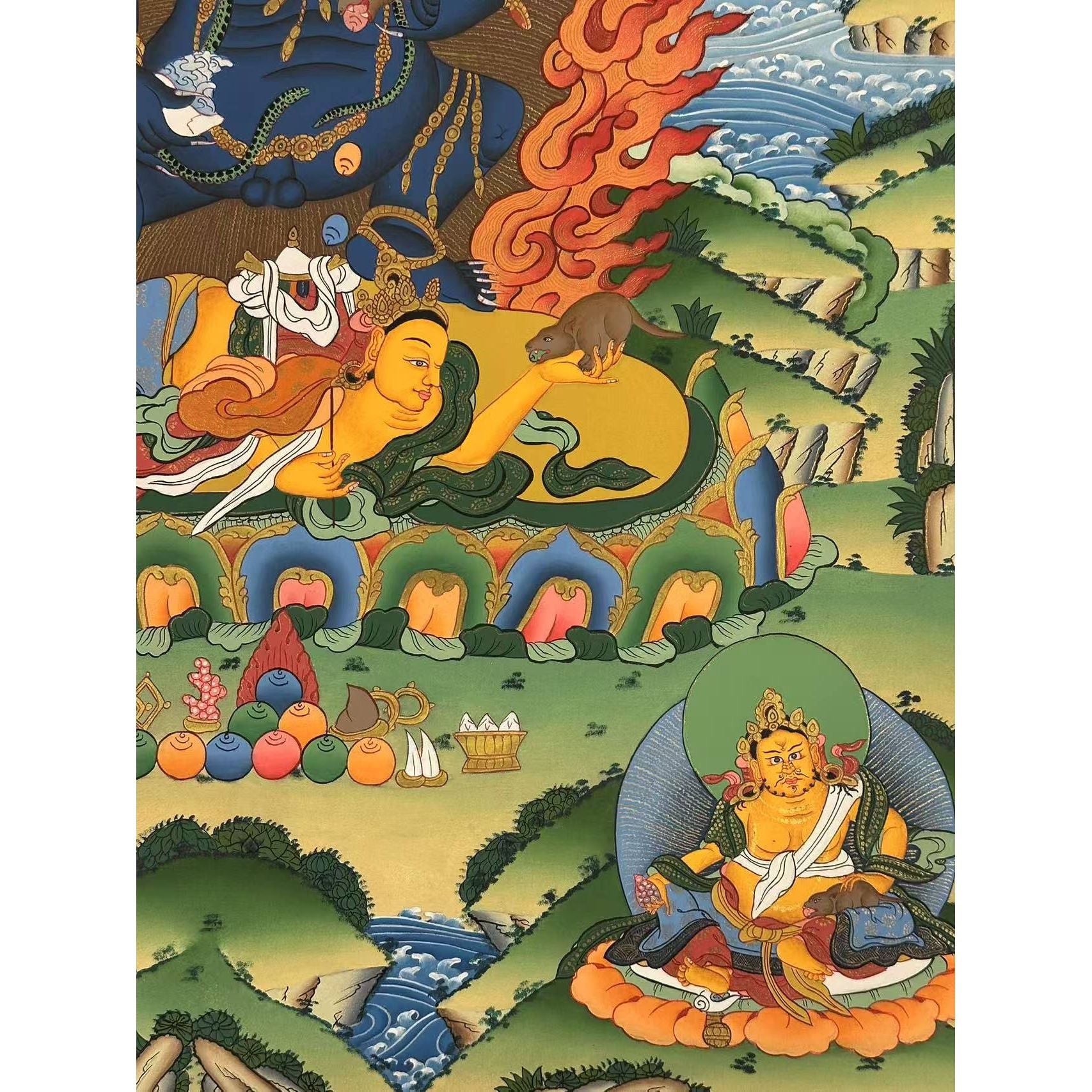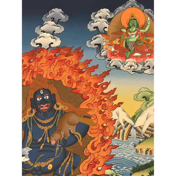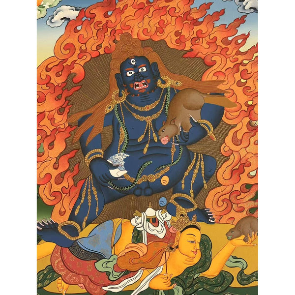 Invite the wealth and blessings of Black Jambhala into your life with this stunning hand-painted Thangka.