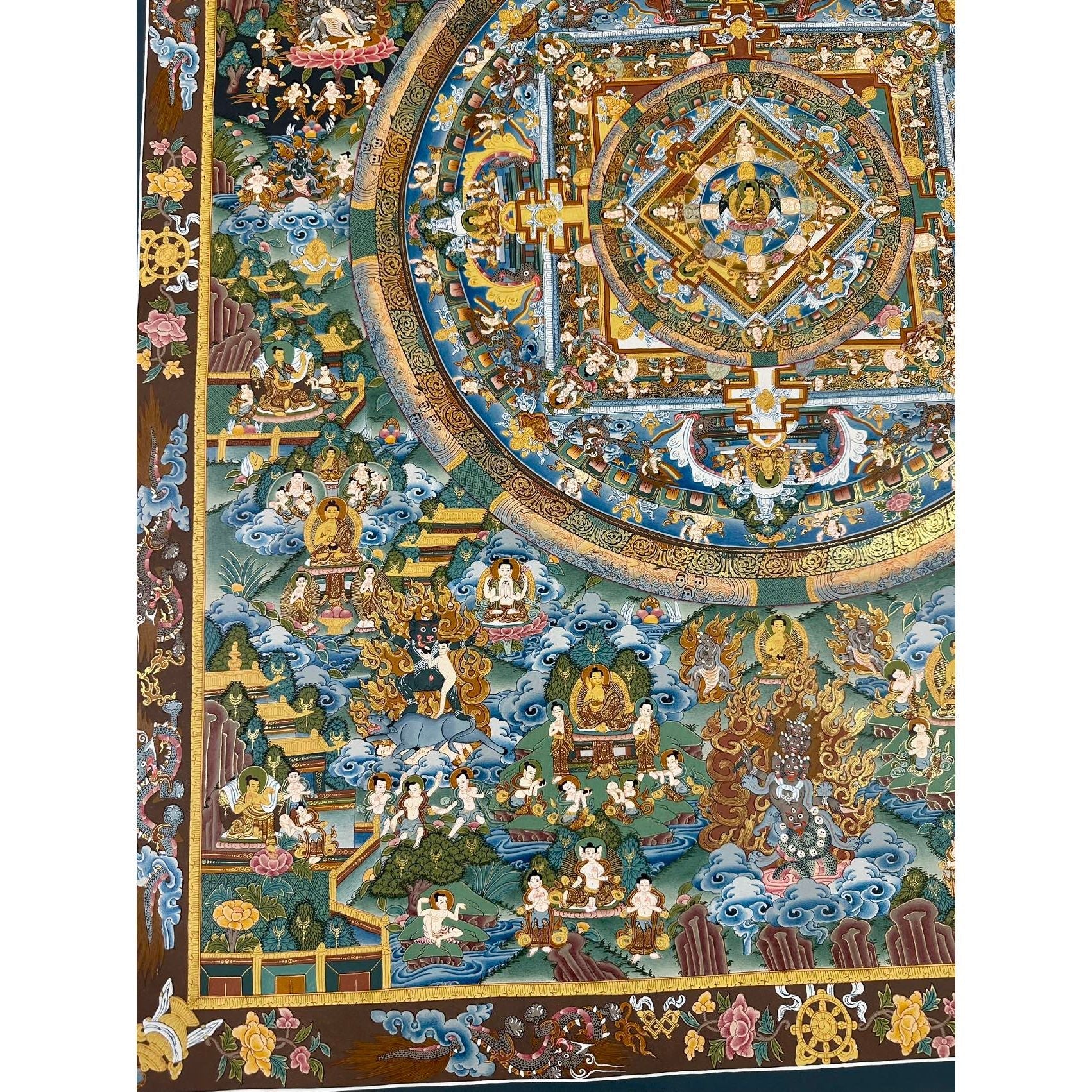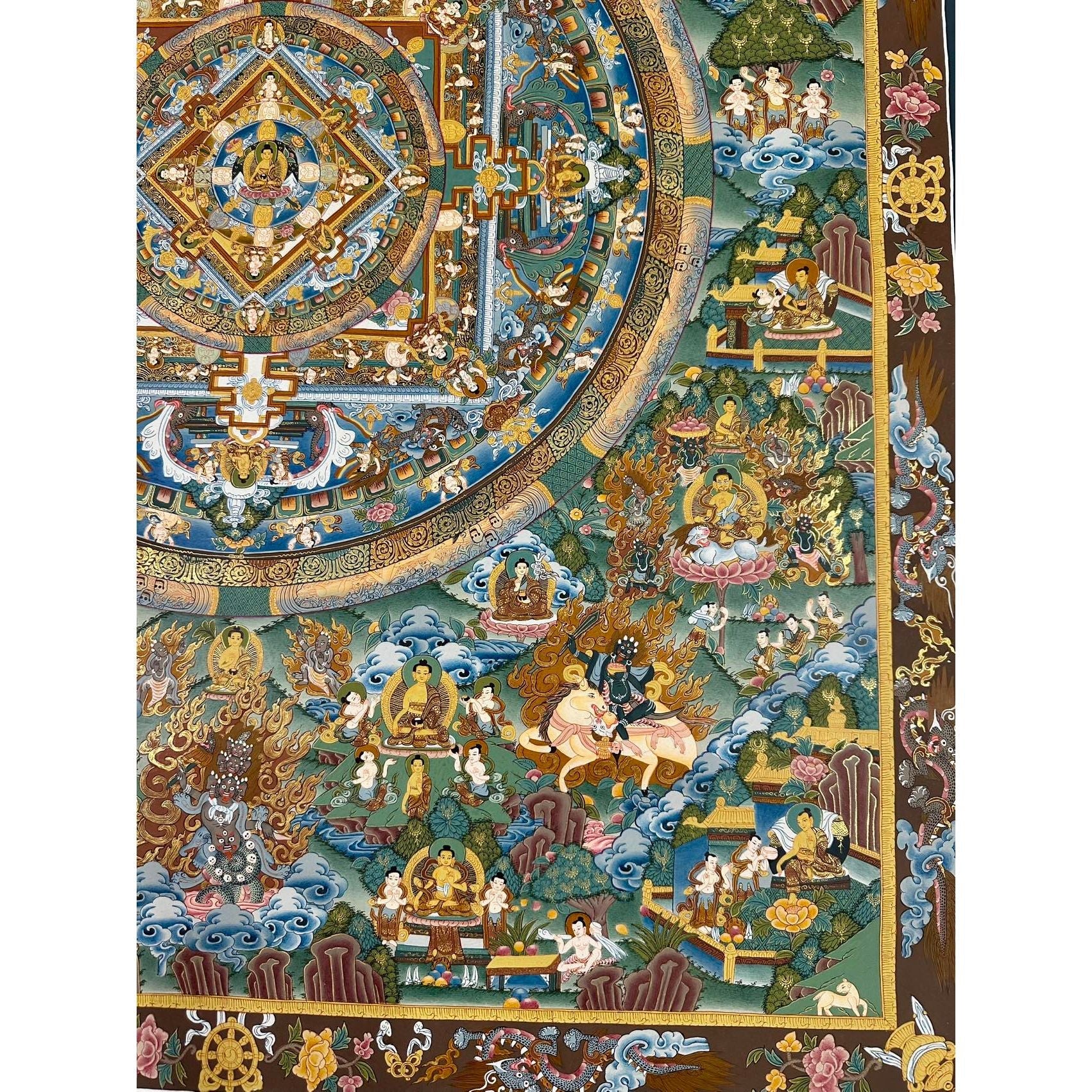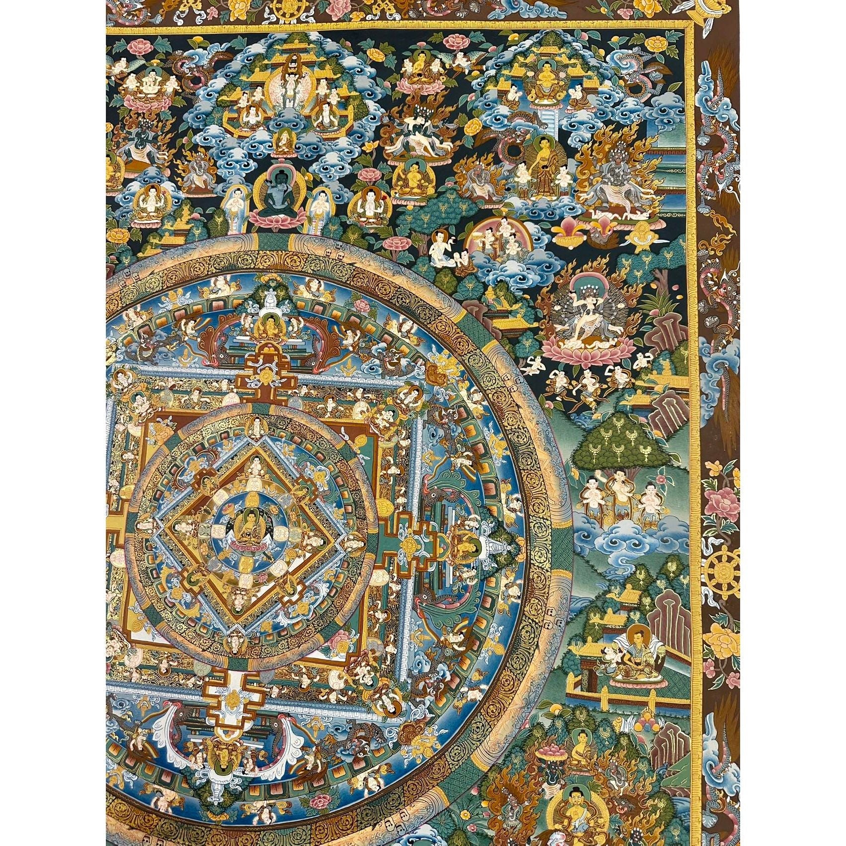 The mandala, with its symmetrical and sacred geometric design, enhances the meaning of Buddha’s life story, symbolizing the universe and the interconnectedness of all beings. This painting provides a deeper reflection on Buddha’s teachings, guiding practitioners and admirers on their spiritual journey.