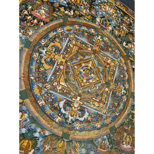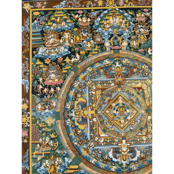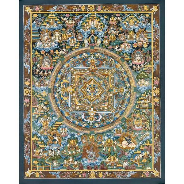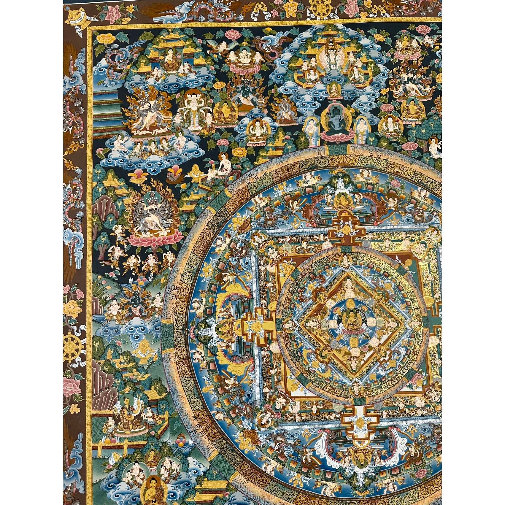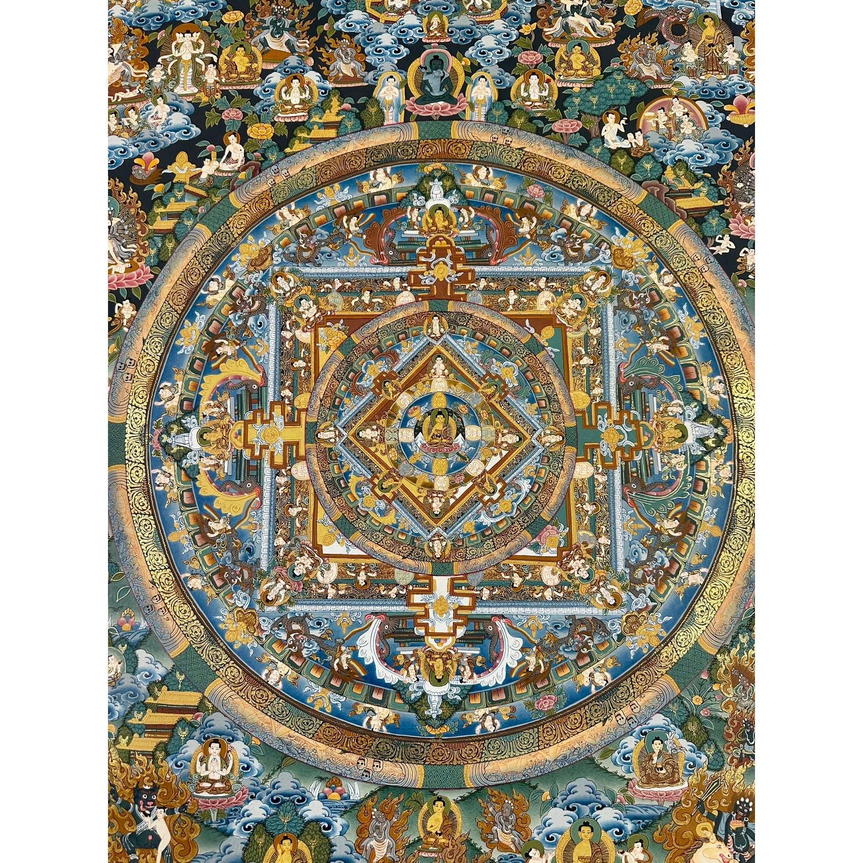 The mandala, with its symmetrical and sacred geometric design, enhances the meaning of Buddha’s life story, symbolizing the universe and the interconnectedness of all beings. This painting provides a deeper reflection on Buddha’s teachings, guiding practitioners and admirers on their spiritual journey.