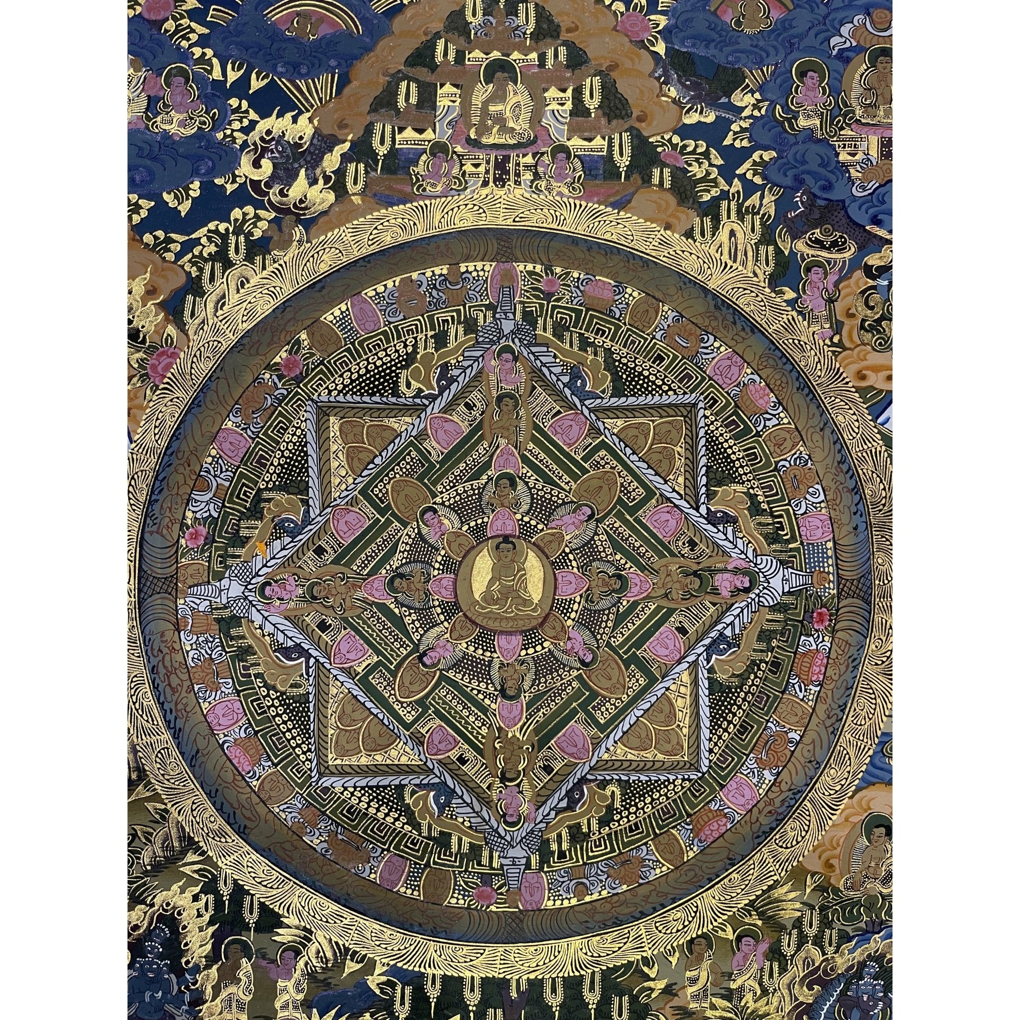 The mandala, with its symmetrical and sacred geometric design, enhances the meaning of Buddha’s life story, symbolizing the universe and the interconnectedness of all beings. This painting provides a deeper reflection on Buddha’s teachings, guiding practitioners and admirers on their spiritual journey.