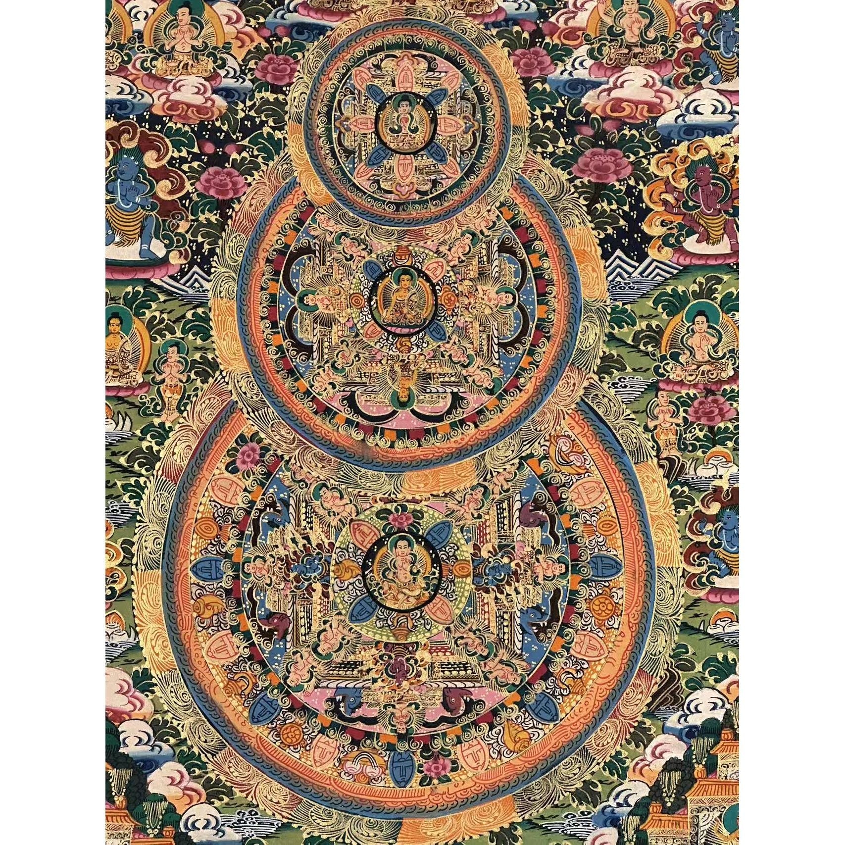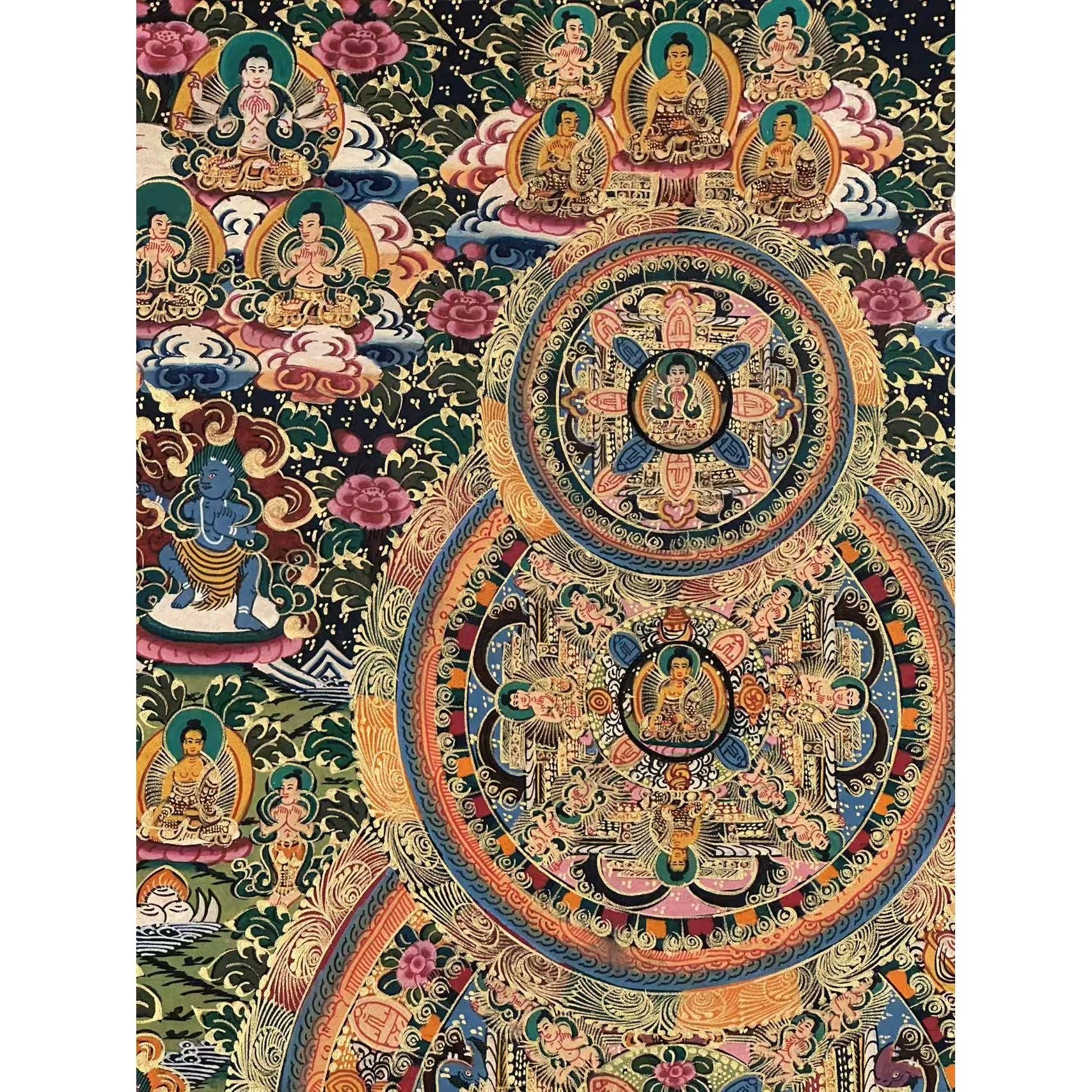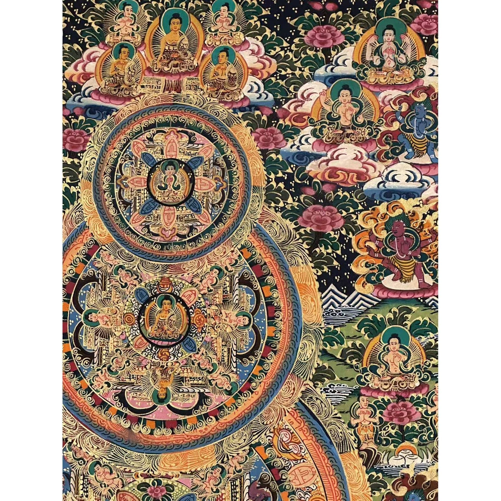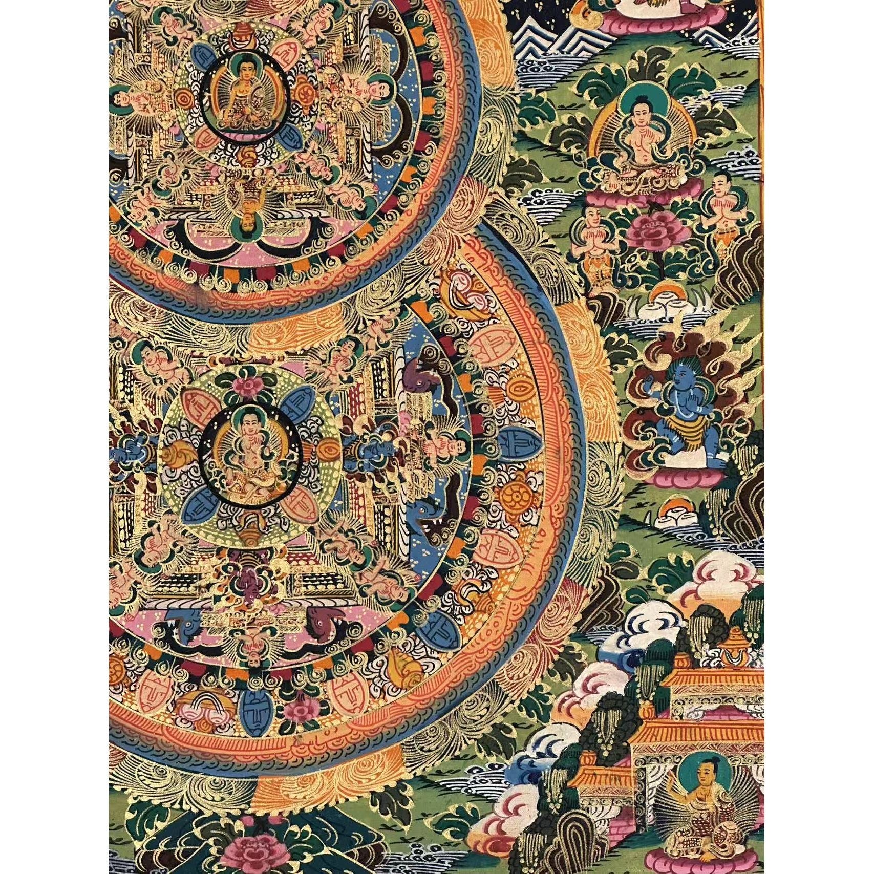 The mandala, with its symmetrical and sacred geometric design, enhances the meaning of Buddha’s life story, symbolizing the universe and the interconnectedness of all beings. This painting provides a deeper reflection on Buddha’s teachings, guiding practitioners and admirers on their spiritual journey.
