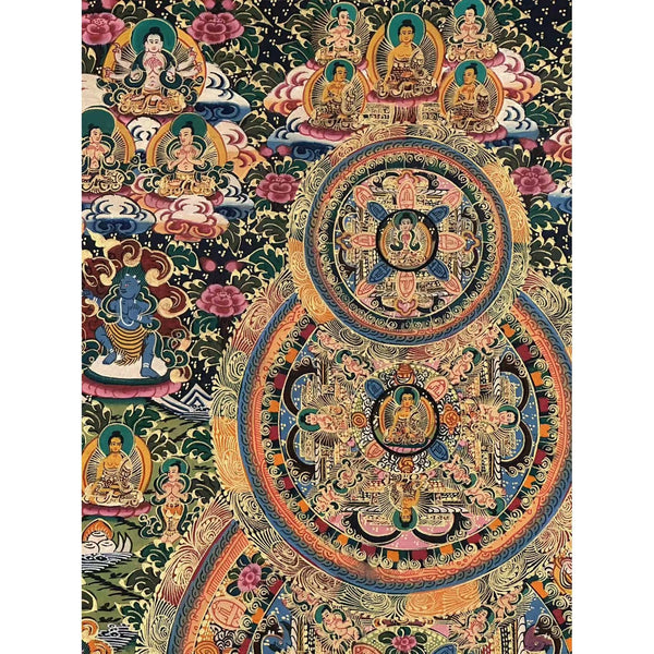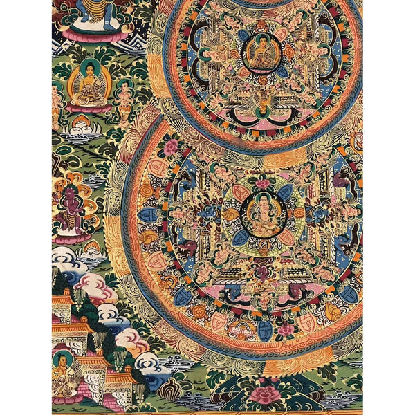 This intricate Buddha Life Story Mandala Thangka is perfect for bringing both spiritual depth and aesthetic beauty to your home or office. Created with exceptional craftsmanship in the Kathmandu Valley, Nepal, this 100% hand-drawn Thangka serves as an elegant centerpiece, ideal for wall décor, or can be placed on your family altar to promote meditation, spiritual healing, and the benevolent energy of Tibetan Buddhist art.