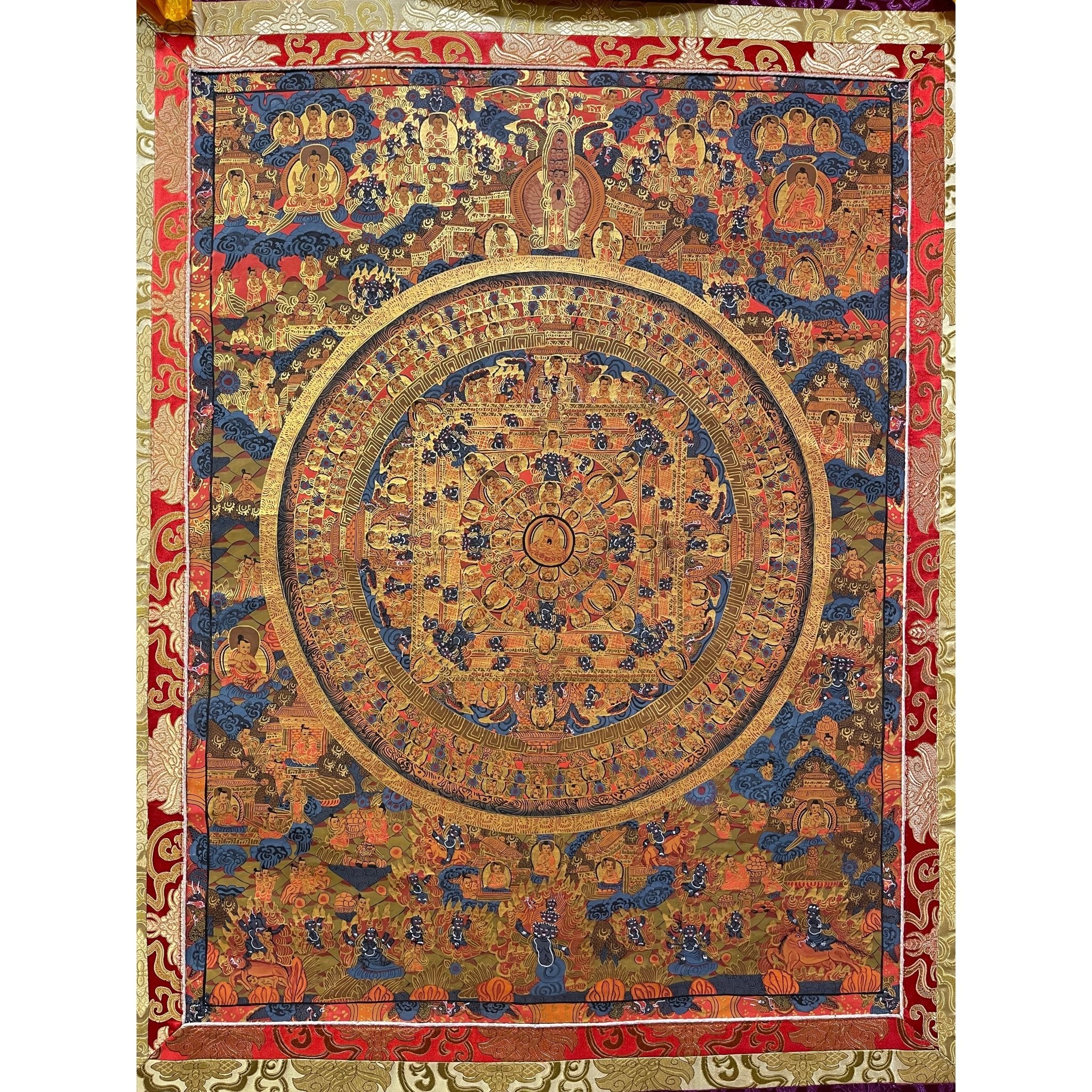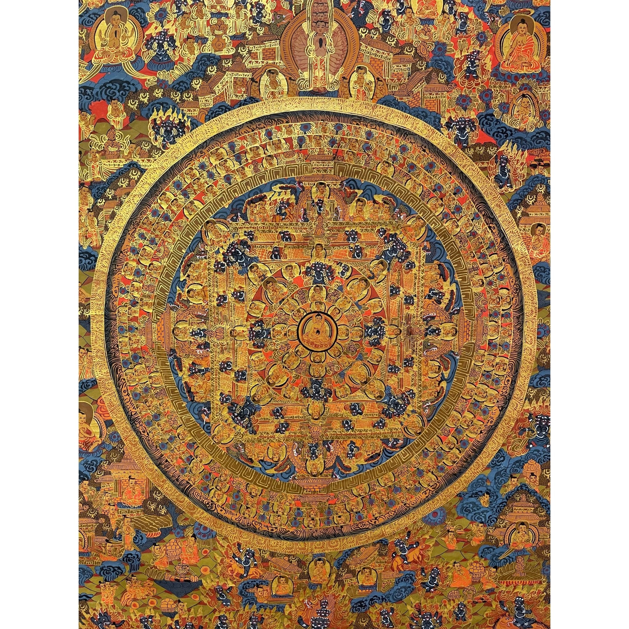 The mandala, with its symmetrical and sacred geometric design, enhances the meaning of Buddha’s life story, symbolizing the universe and the interconnectedness of all beings. This painting provides a deeper reflection on Buddha’s teachings, guiding practitioners and admirers on their spiritual journey.