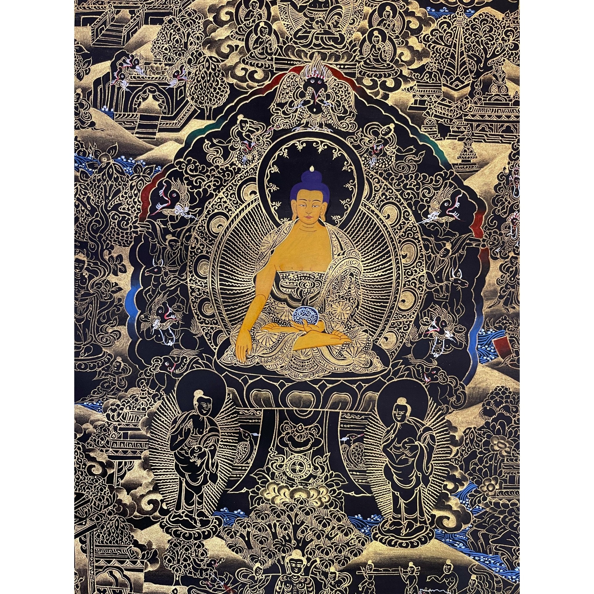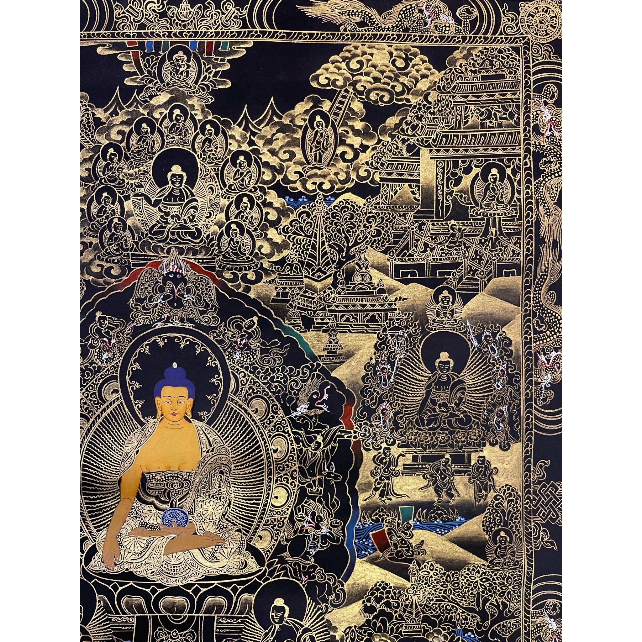 About Buddha Life Story Thangka Art This stunning Thangka painting beautifully depicts the key episodes of Lord Buddha’s life and his journey toward spiritual enlightenment. The twelve main events illustrated in the Thangka represent the three significant phases of Siddhartha’s life: