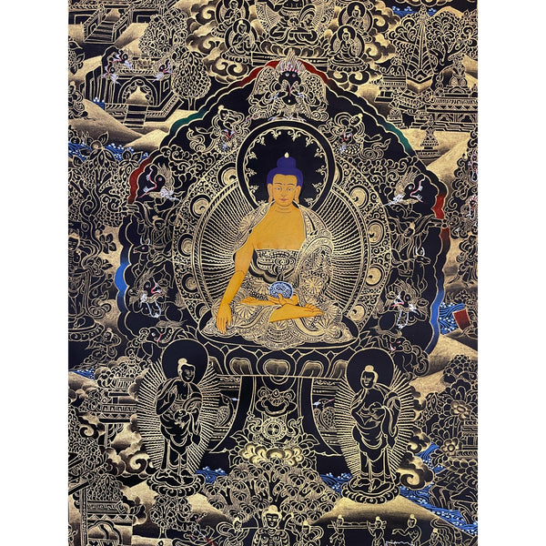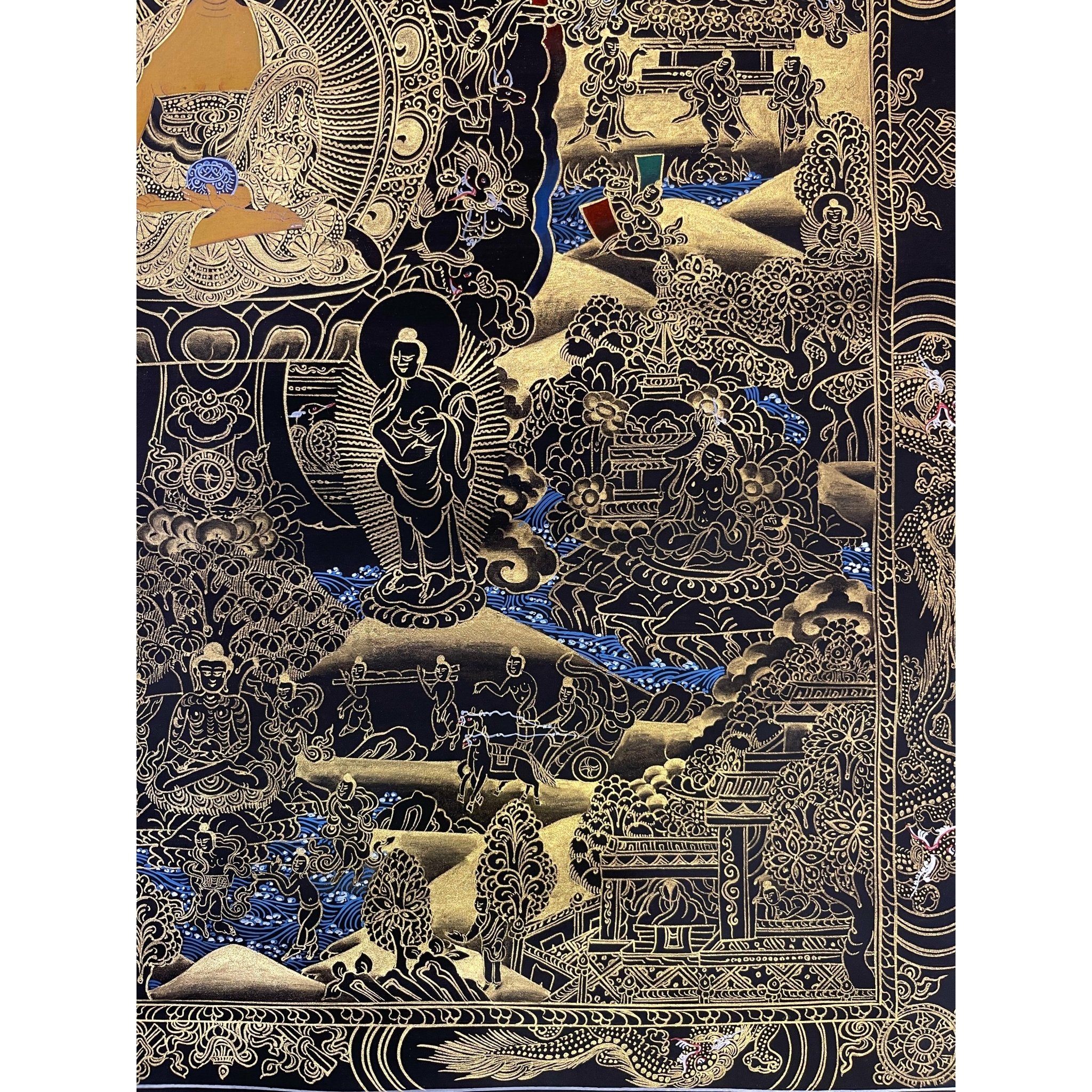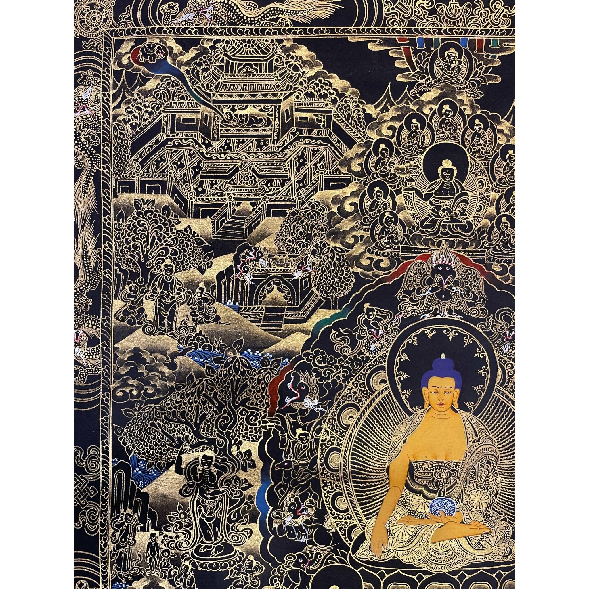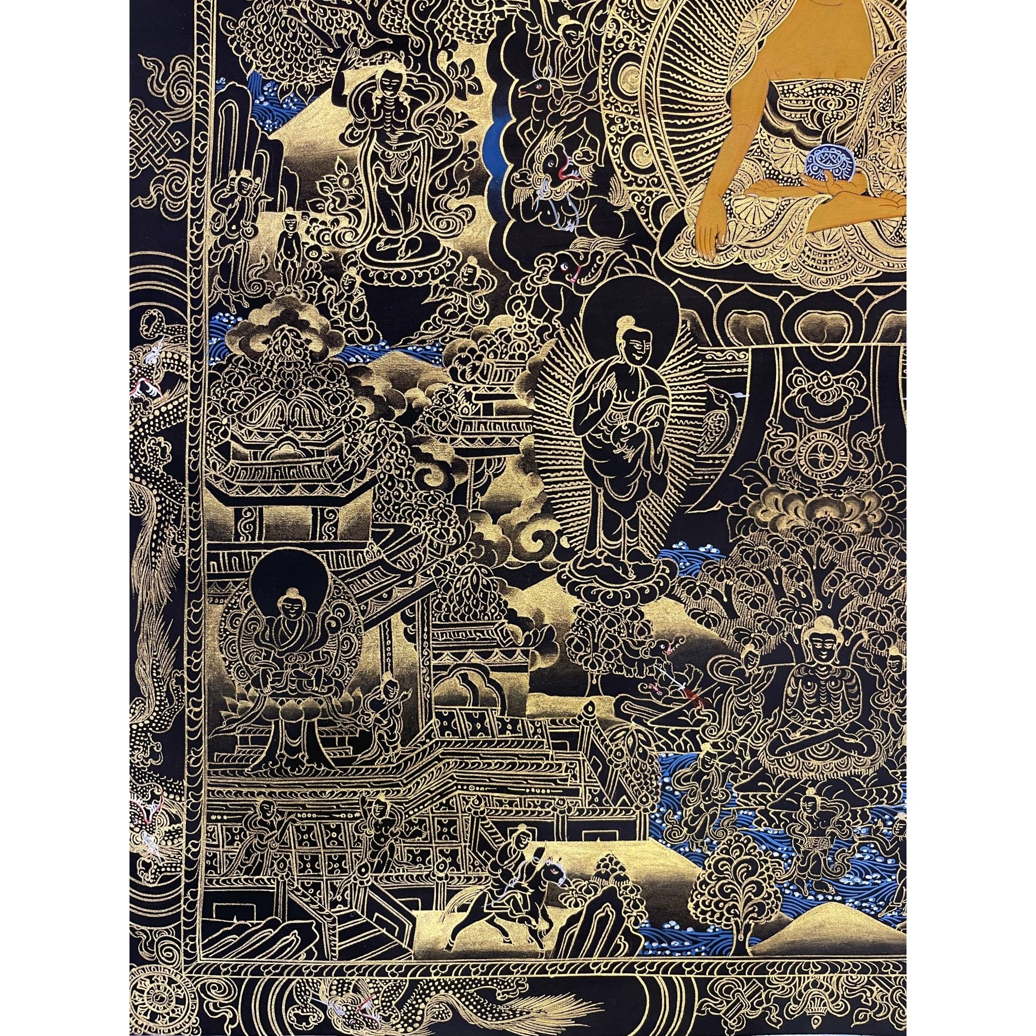 This exquisite Buddha Life Story Thangka is perfect for adding depth and spirituality to your home or office décor. Created with the finest craftsmanship in the Kathmandu Valley, Nepal, this 100% hand-drawn Thangka painting can serve as a striking centerpiece or be placed on your family altar for meditation, spiritual healing, and attracting the benevolent energy of Tibetan Buddhist art.