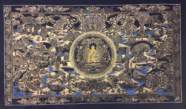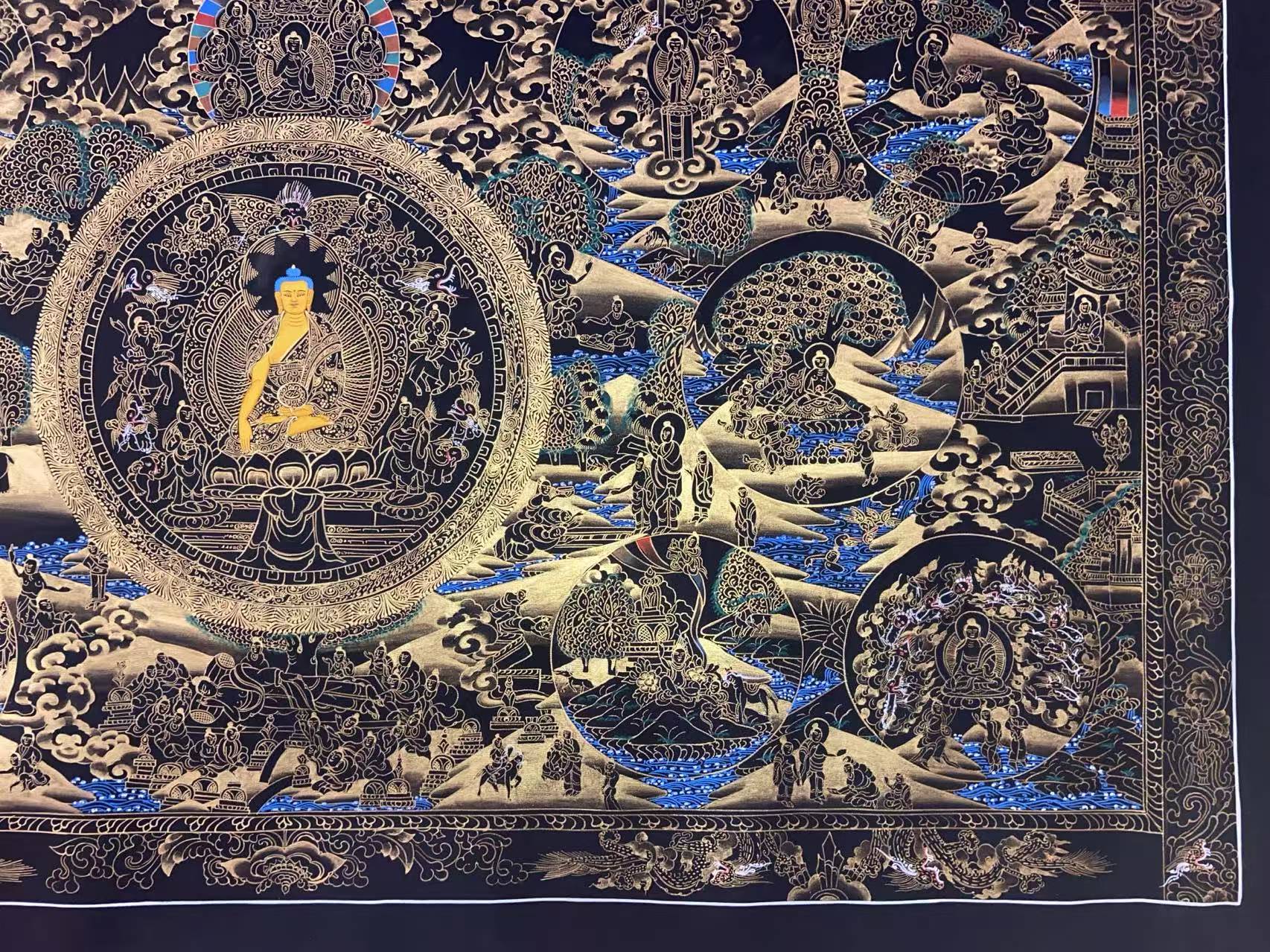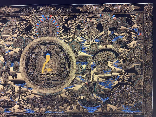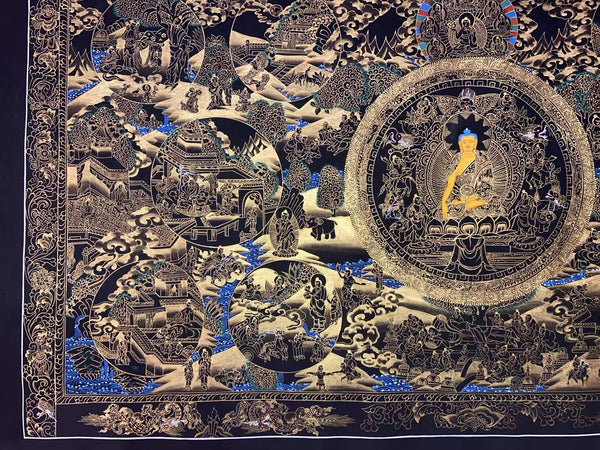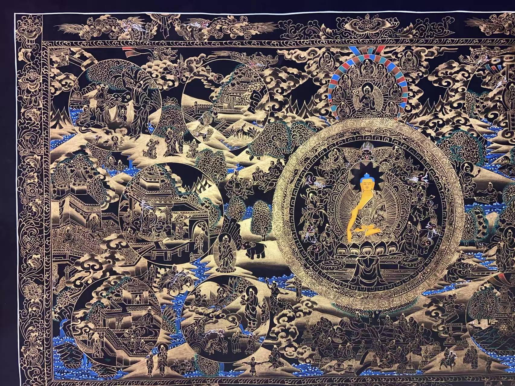 This exquisite Buddha Life Story Thangka is perfect for adding depth and spirituality to your home or office décor. Created with the finest craftsmanship in the Kathmandu Valley, Nepal, this 100% hand-drawn Thangka painting can serve as a striking centerpiece or be placed on your family altar for meditation, spiritual healing, and attracting the benevolent energy of Tibetan Buddhist art.