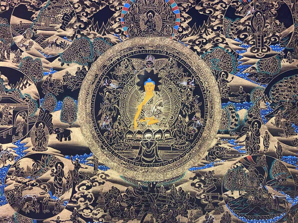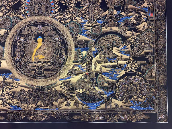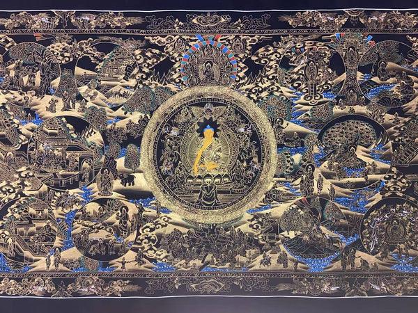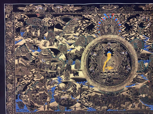 This Thangka not only captures the essence of Buddha's life but also serves as a powerful reminder of the core teachings of Buddhism, emphasizing compassion, wisdom, and the path toward inner peace.