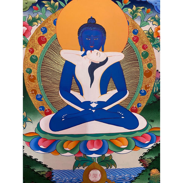 About Buddha Shakti – The Sacred Union This Thangka depicts the profound Buddhist symbolism of Yab-yum (Tibetan: "father-mother"), a powerful representation of the primordial union of wisdom and compassion. In this iconic pose, the male deity represents compassion (karuṇā) and skillful means (upāya-kauśalya), while the female consort embodies wisdom (prajñā). The female figure is traditionally seated on the male’s lap, signifying the inseparable connection between these two essential qualities of the Buddha's path.
