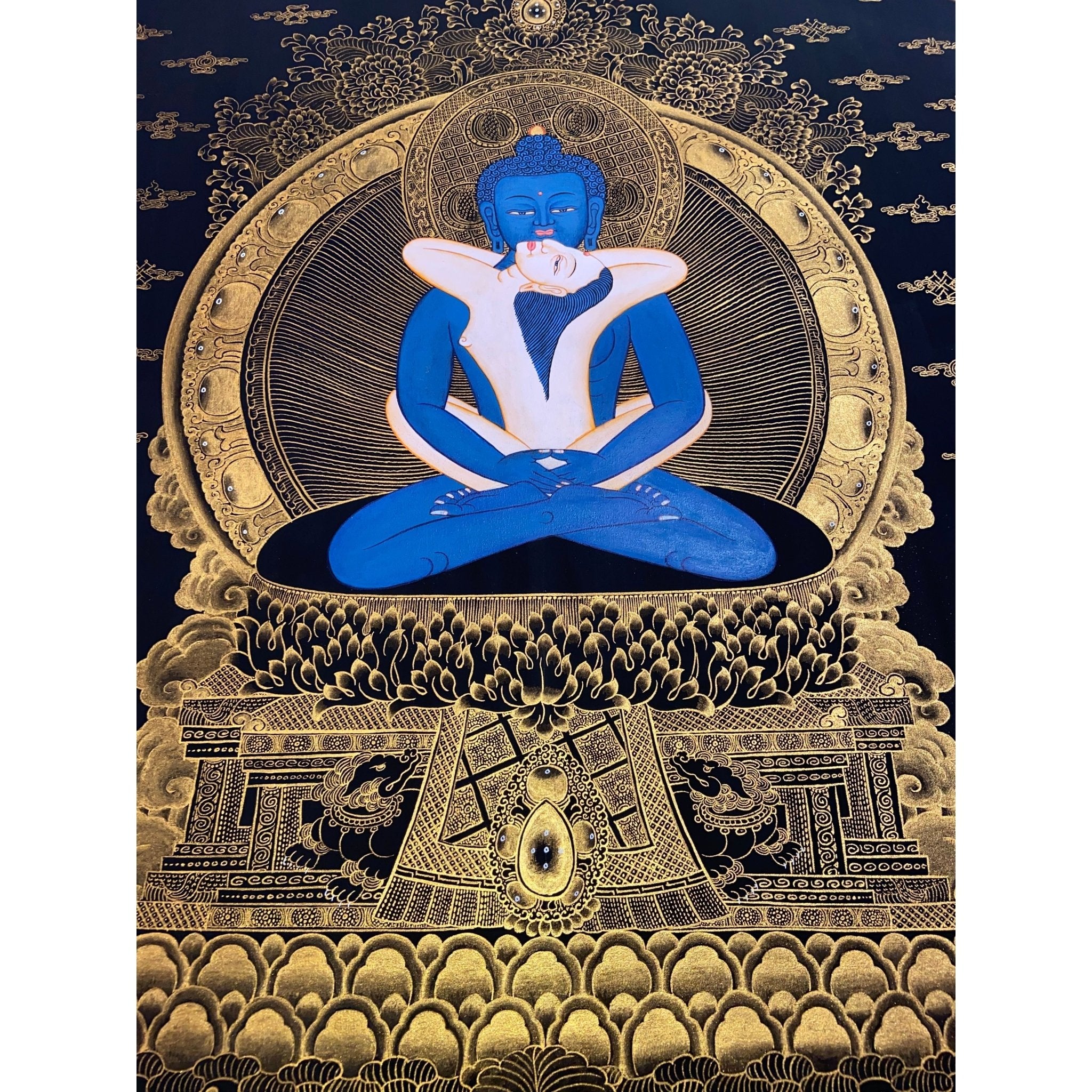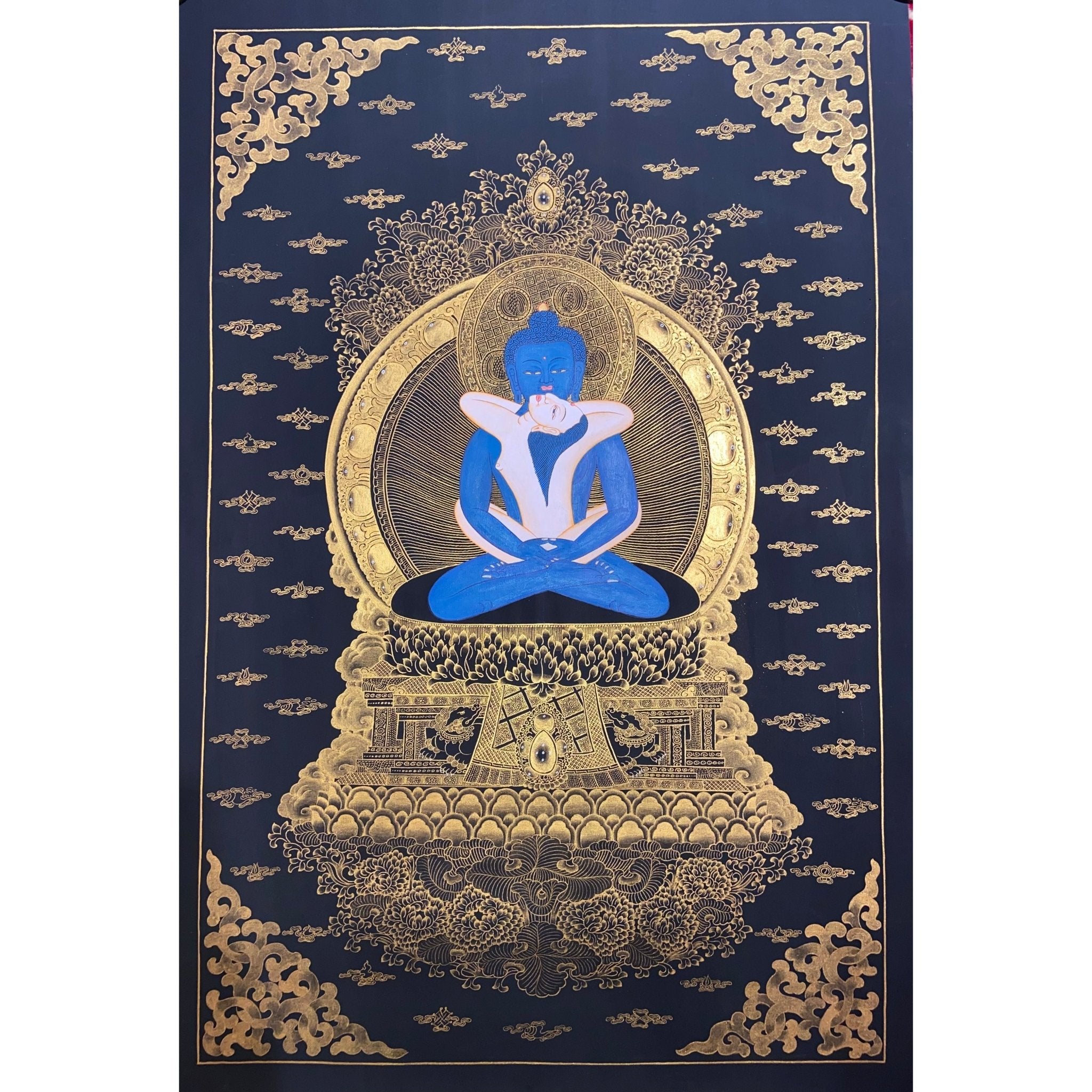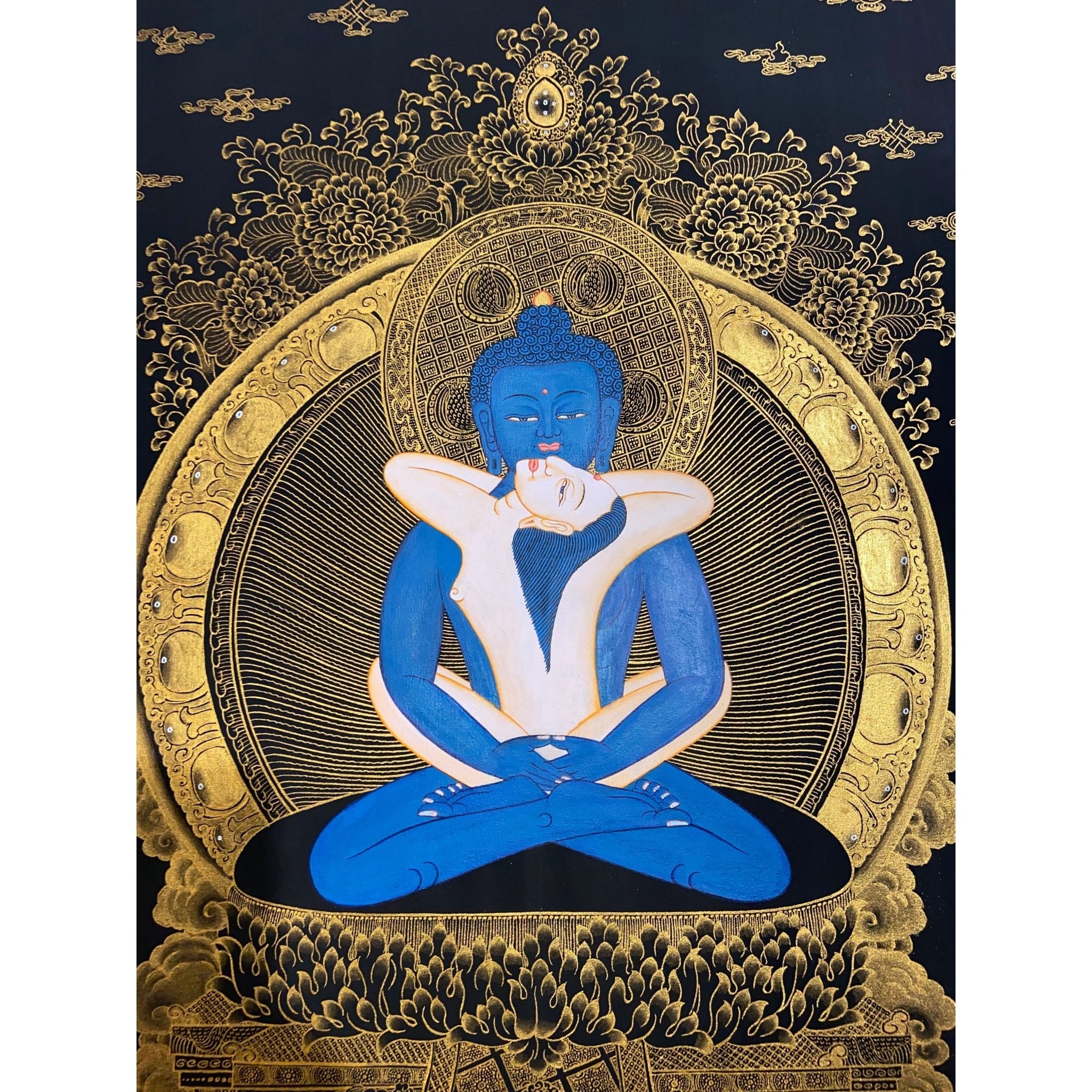 About Buddha Shakti – The Sacred Union This Thangka depicts the profound Buddhist symbolism of Yab-yum (Tibetan: "father-mother"), a powerful representation of the primordial union of wisdom and compassion. In this iconic pose, the male deity represents compassion (karuṇā) and skillful means (upāya-kauśalya), while the female consort embodies wisdom (prajñā). The female figure is traditionally seated on the male’s lap, signifying the inseparable connection between these two essential qualities of the Buddha's path.