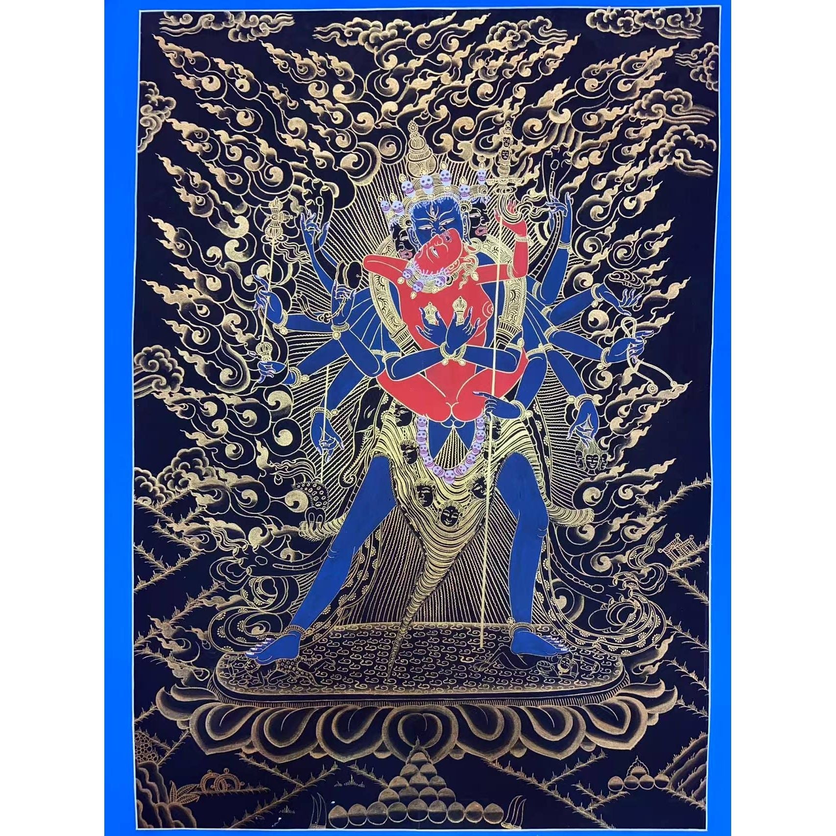 Spiritual Significance: A powerful depiction of Chakrasamvara’s role in Tantric Buddhist practice, aiding in the removal of obstacles and the attainment of spiritual bliss.