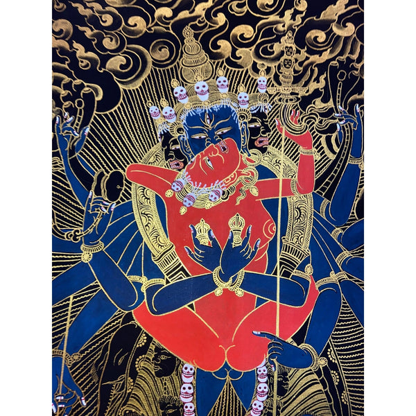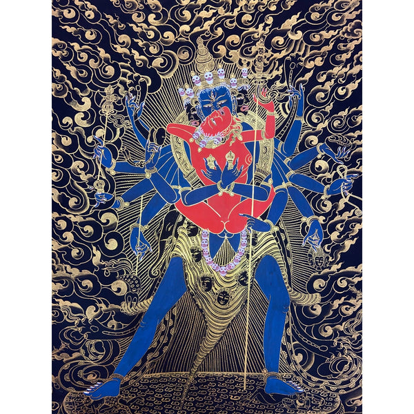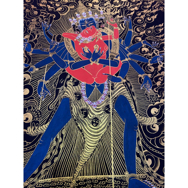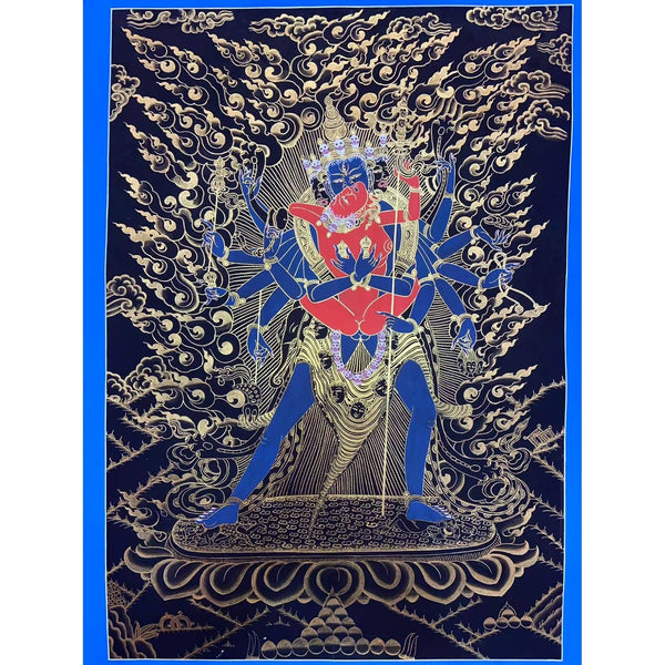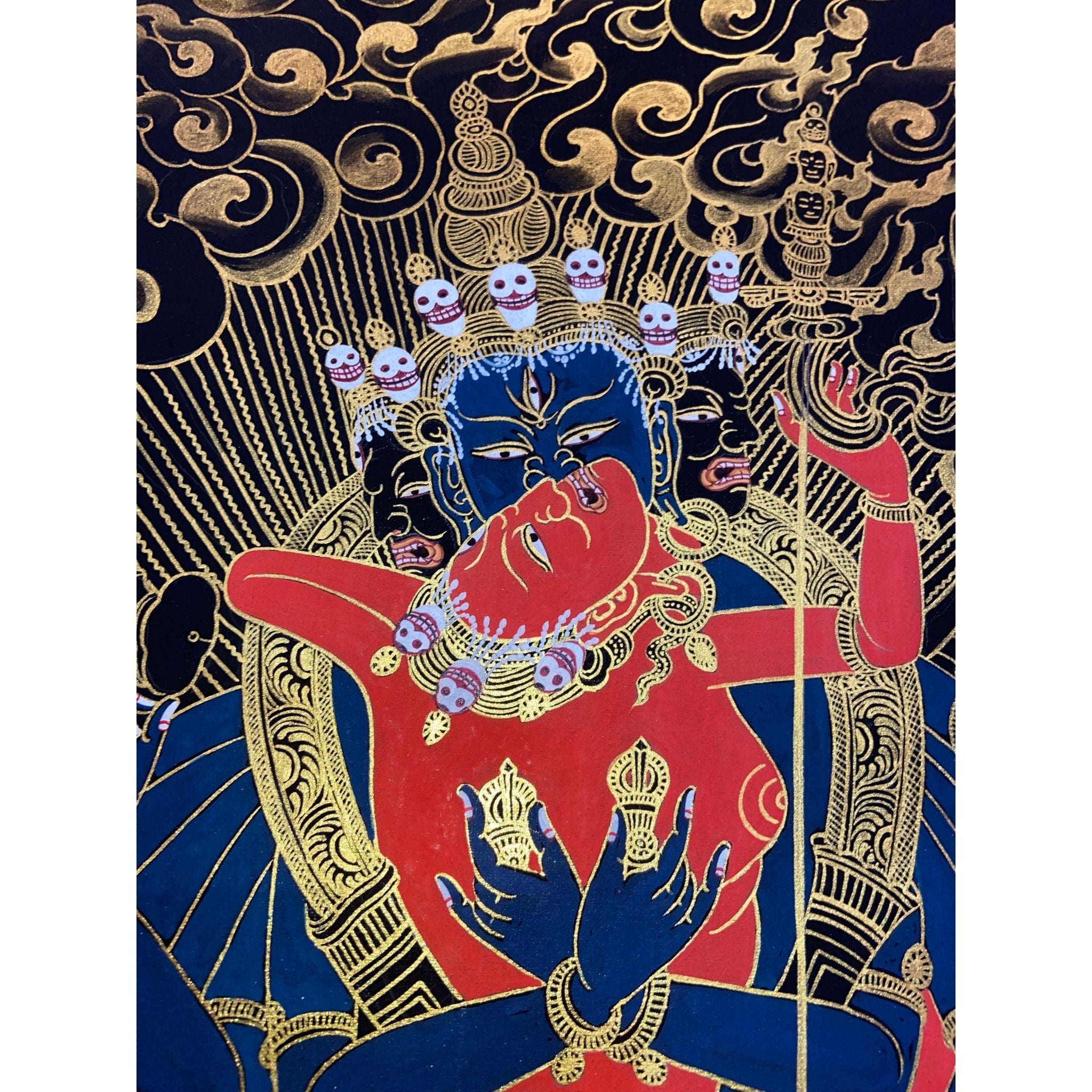 The Thangka depicts Shri Chakrasamvara, a blue deity with four faces (blue, red, yellow, and white) and twelve hands. Each face is adorned with three eyes and bared fangs, symbolizing his profound wisdom and power. Chakrasamvara’s posture is dynamic, as he presses his right leg on the breast of Kalaratri, a fierce red deity, and his left leg on the head of Yama, the lord of death.