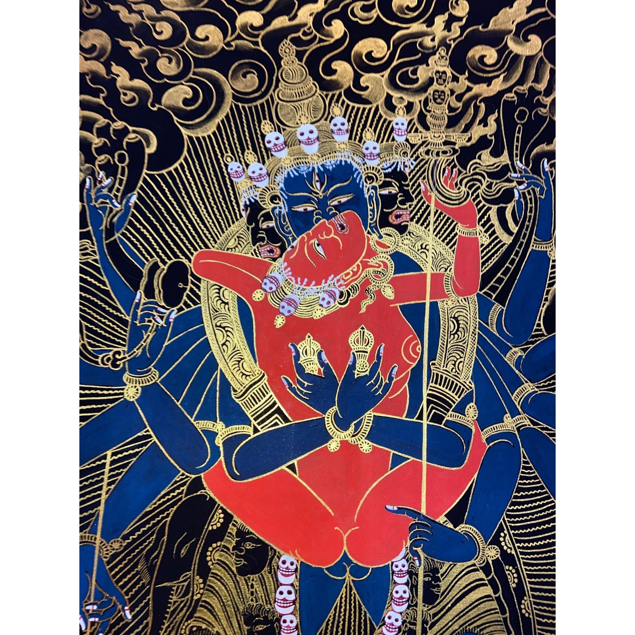 The deity is accompanied by Vajravarahi, his red consort, who embraces him in a dance of divine union. She holds a blood-filled skullcup in one hand and a curved knife in the other, symbolizing the transformative power of wisdom and compassion. Together, they are surrounded by a blazing fire of pristine awareness, representing the transformative power of their union.
