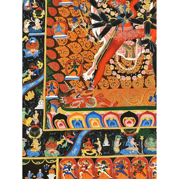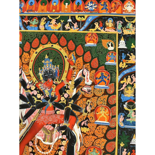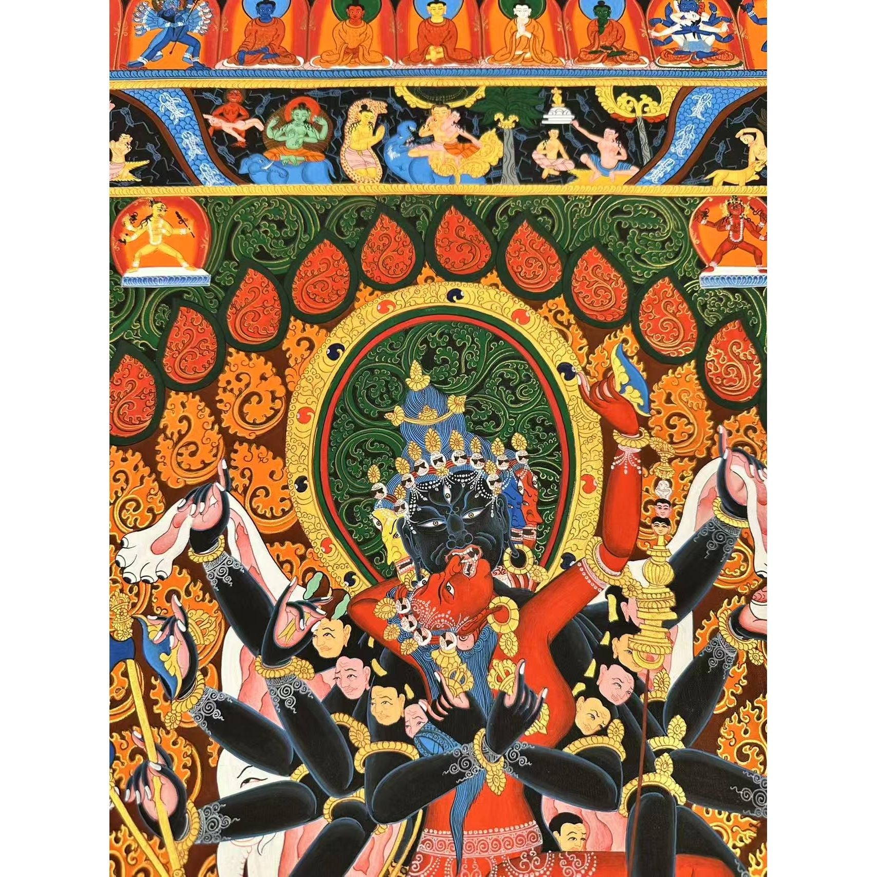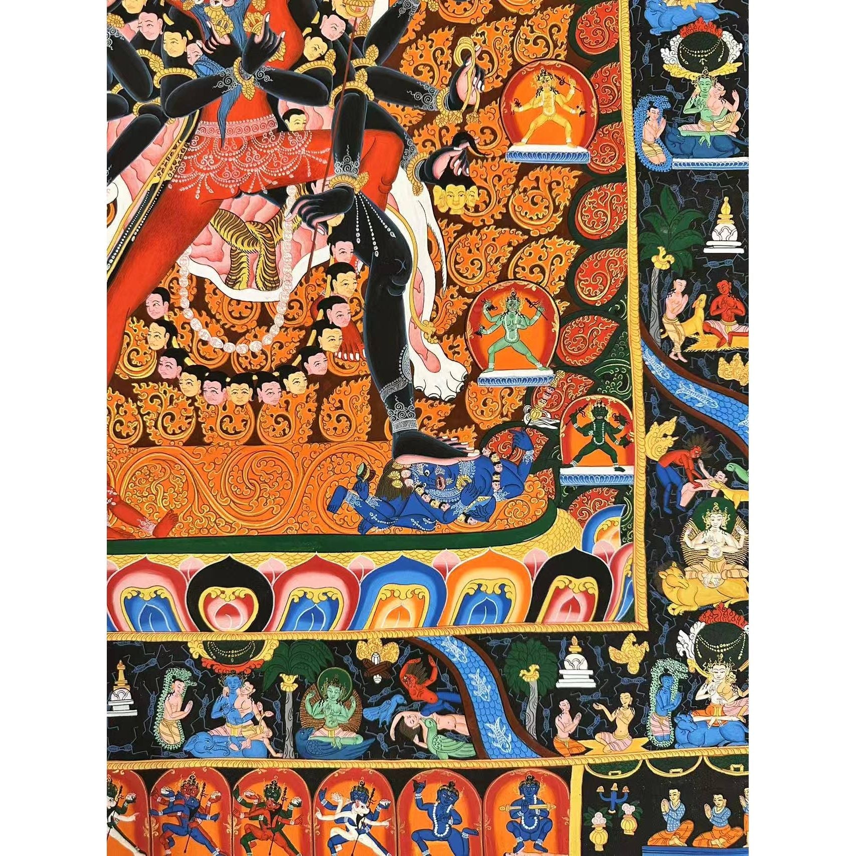 The Thangka depicts Shri Chakrasamvara, a blue deity with four faces (blue, red, yellow, and white) and twelve hands. Each face is adorned with three eyes and bared fangs, symbolizing his profound wisdom and power. Chakrasamvara’s posture is dynamic, as he presses his right leg on the breast of Kalaratri, a fierce red deity, and his left leg on the head of Yama, the lord of death.