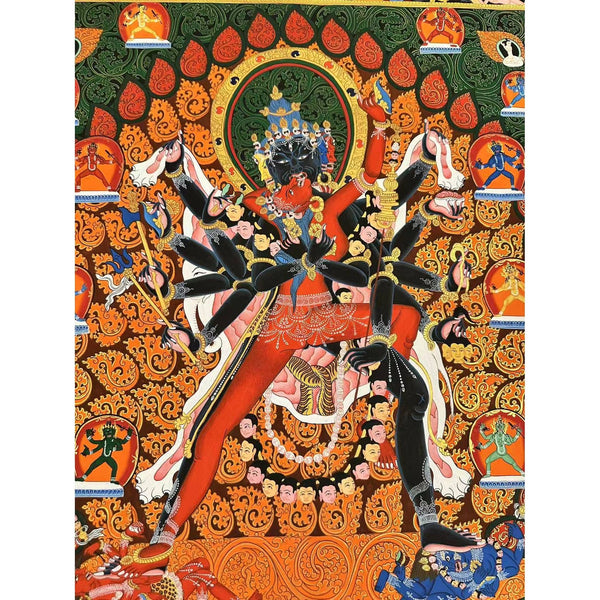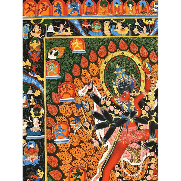 The deity is accompanied by Vajravarahi, his red consort, who embraces him in a dance of divine union. She holds a blood-filled skullcup in one hand and a curved knife in the other, symbolizing the transformative power of wisdom and compassion. Together, they are surrounded by a blazing fire of pristine awareness, representing the transformative power of their union.
