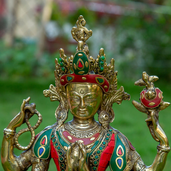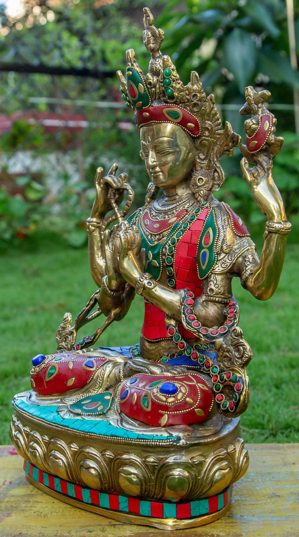This exquisite Pure Bronze Chenrezig Buddha statue, adorned with coral, turquoise, and lapis lazuli inlays, represents the embodiment of boundless compassion in Buddhism. Known also as Avalokiteshvara, Chenrezig is venerated as the Bodhisattva who made the profound vow not to rest until all beings are free from suffering. The statue beautifully portrays Chenrezig’s serene presence, divine ornaments, and calm expression, radiating unconditional love and mercy.