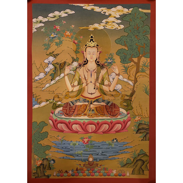 This 100% hand-drawn Chenrezig Thangka is an exquisite representation of the Bodhisattva of Compassion. Made in the Kathmandu Valley, Nepal, this Thangka not only serves as an elegant decoration but also brings profound spiritual energy to any space. It can be displayed as a focal point in your home or office or placed on your family altar for meditation, attracting the benevolent energy of Tibetan Buddhist art.