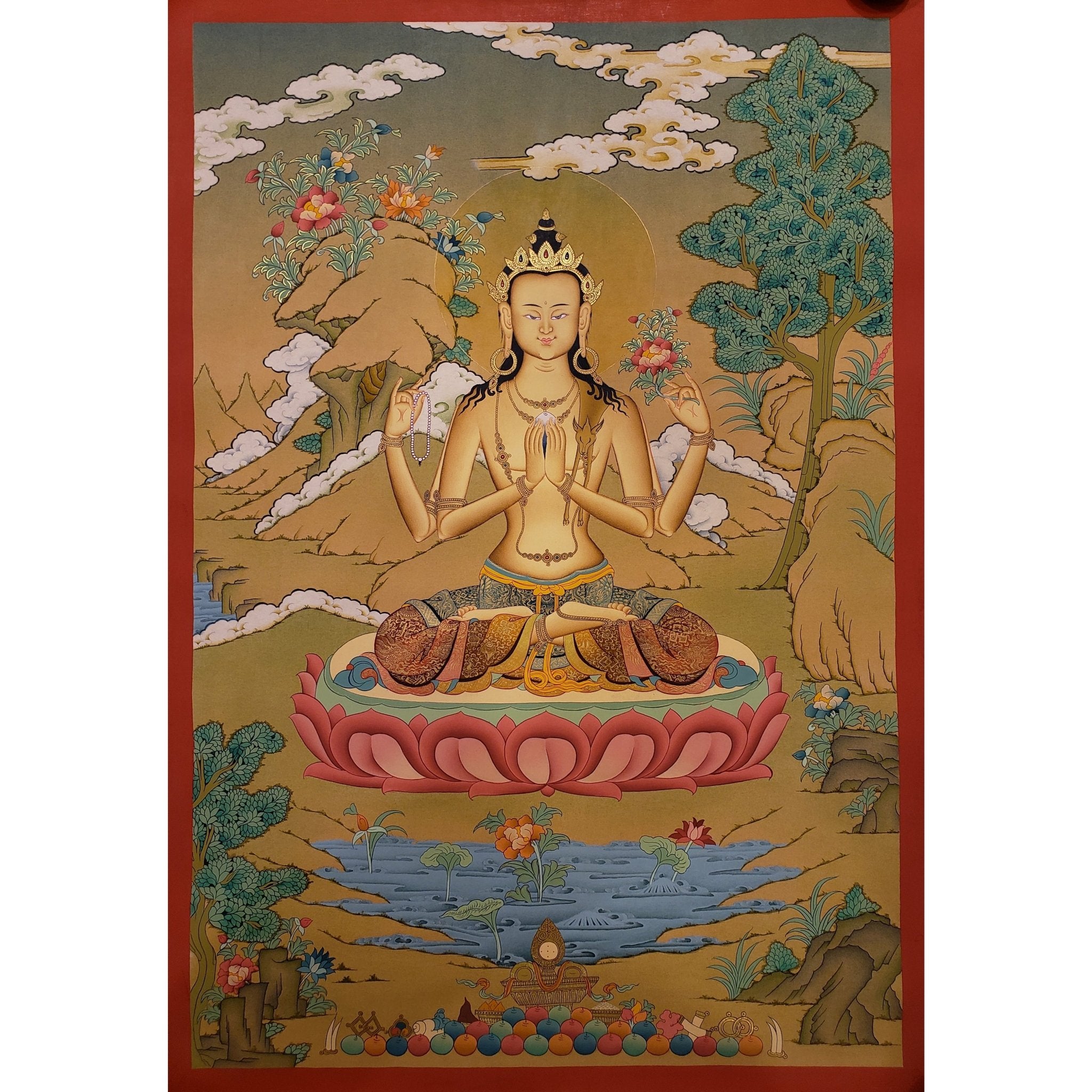 Symbol of Compassion: Chenrezig’s depiction emphasizes the boundless compassion for all living beings, offering a reminder to practice kindness and empathy.