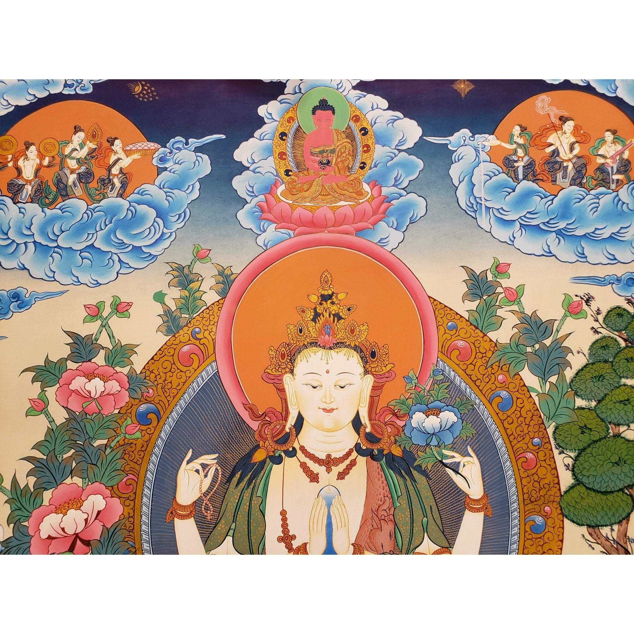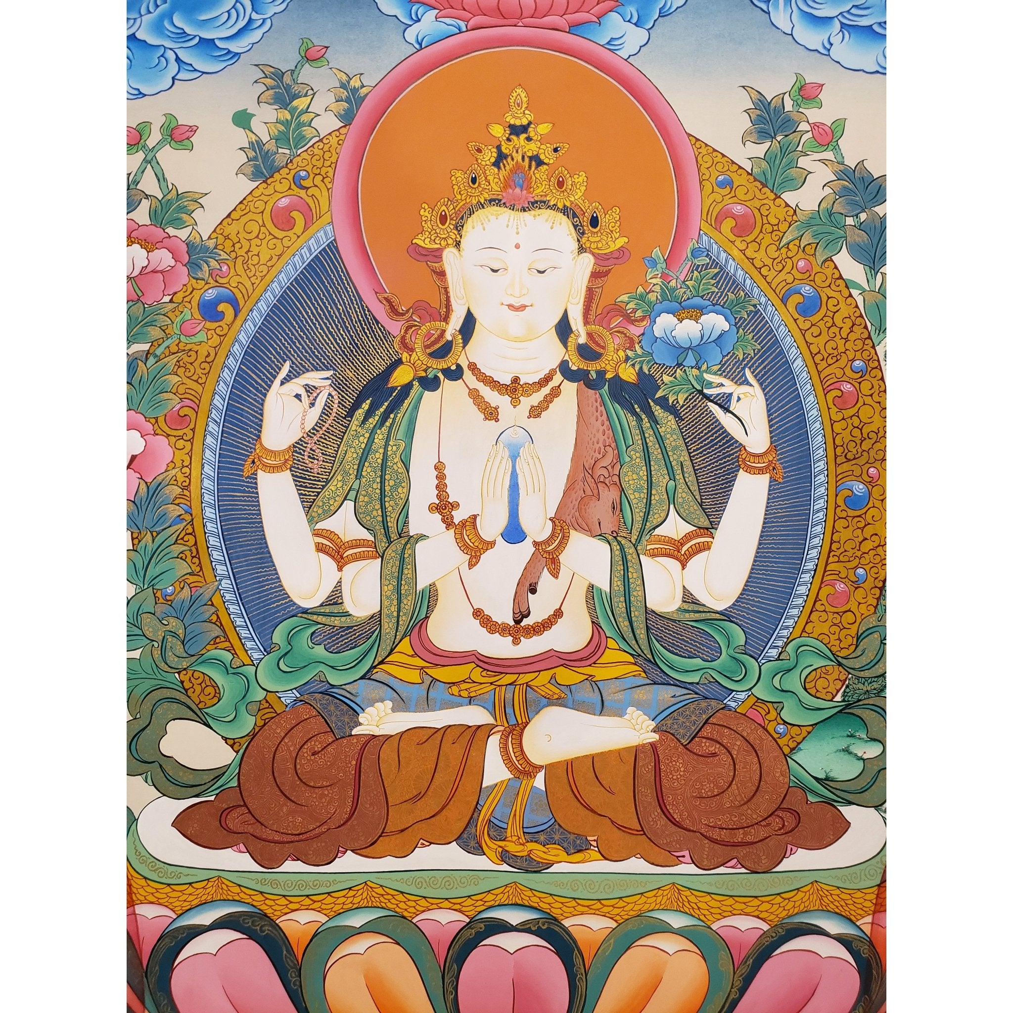 Symbol of Compassion: Chenrezig’s depiction emphasizes the boundless compassion for all living beings, offering a reminder to practice kindness and empathy.