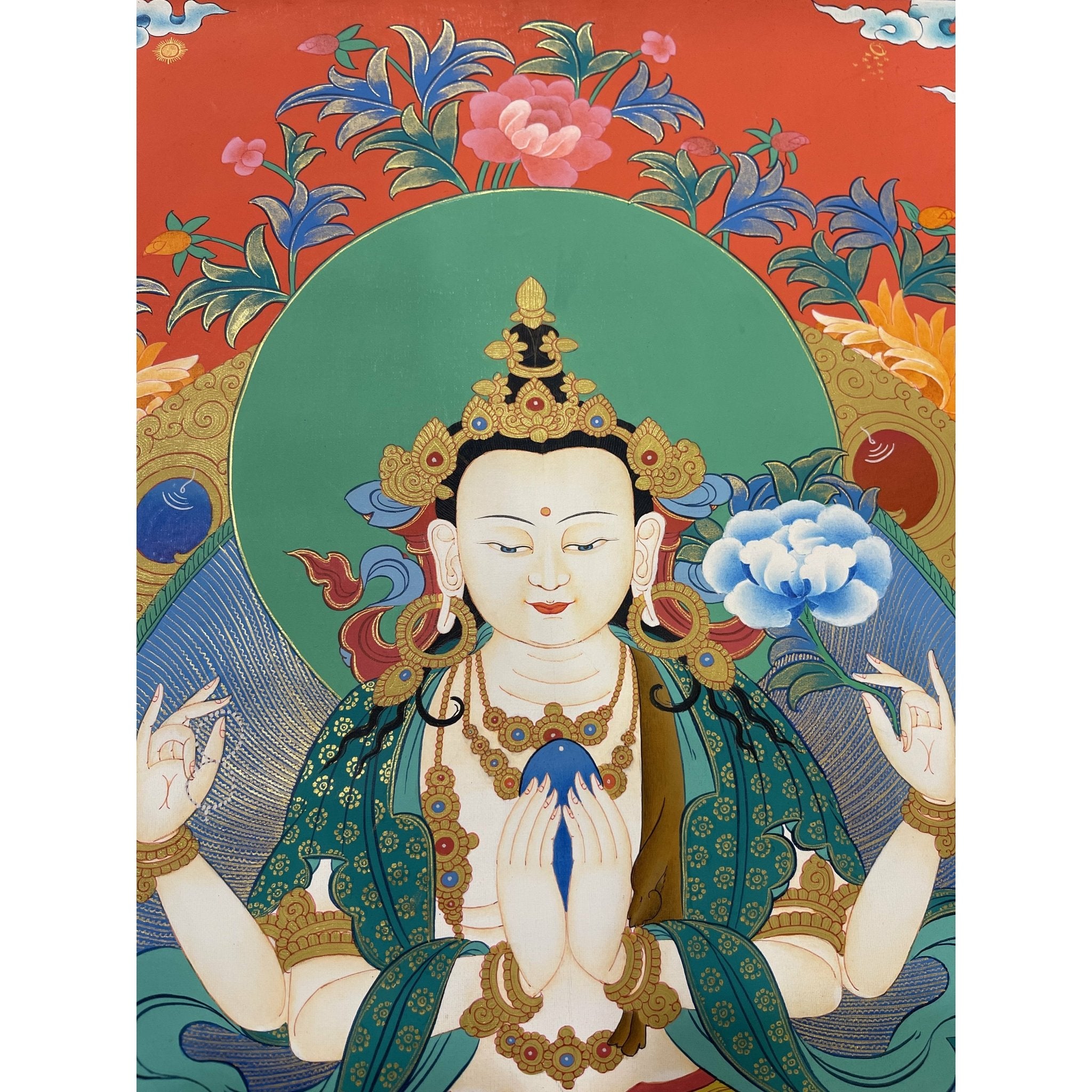Symbol of Compassion: Chenrezig’s depiction emphasizes the boundless compassion for all living beings, offering a reminder to practice kindness and empathy.
