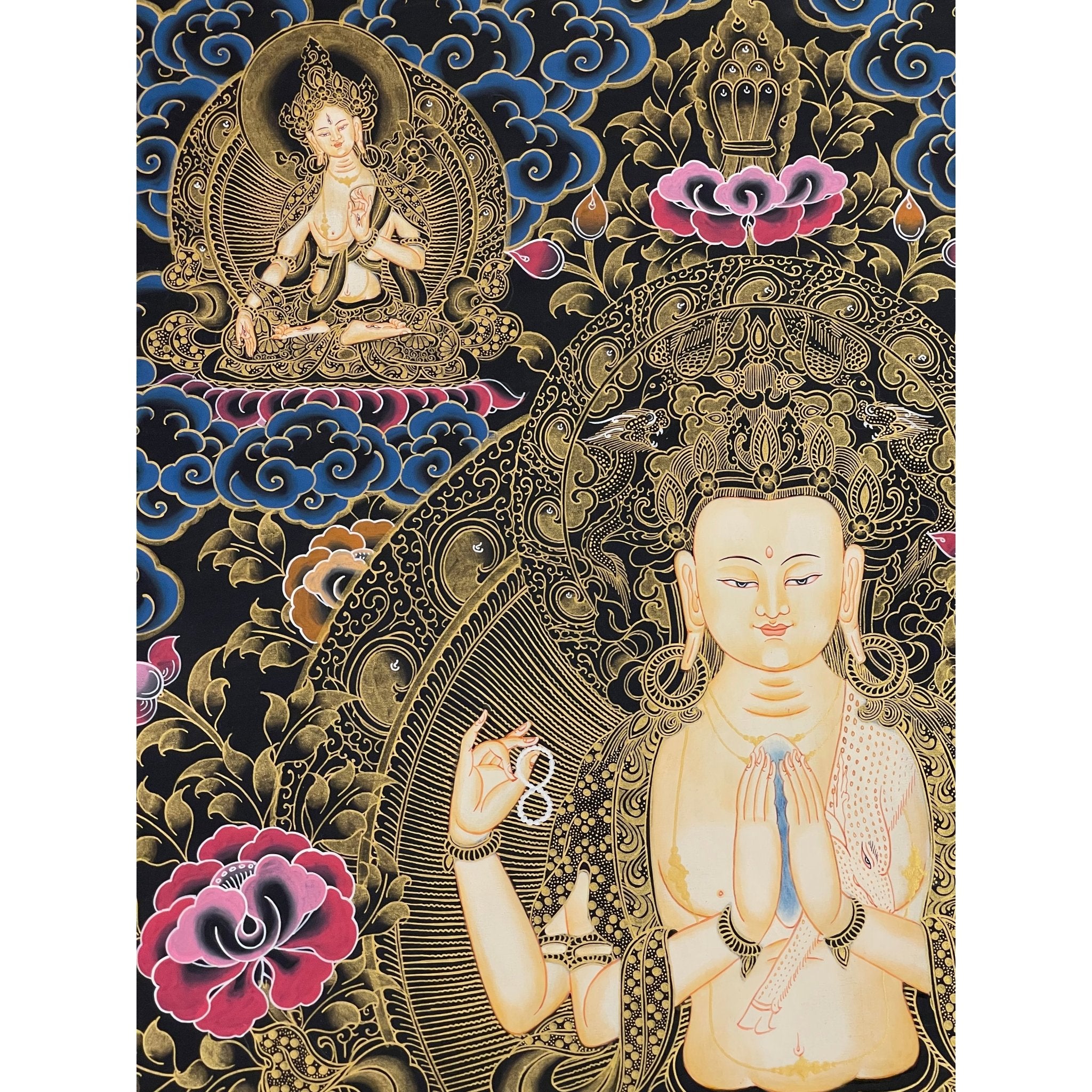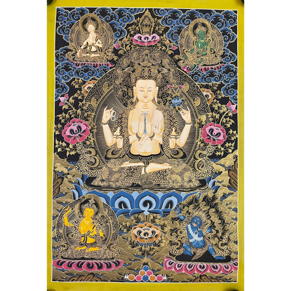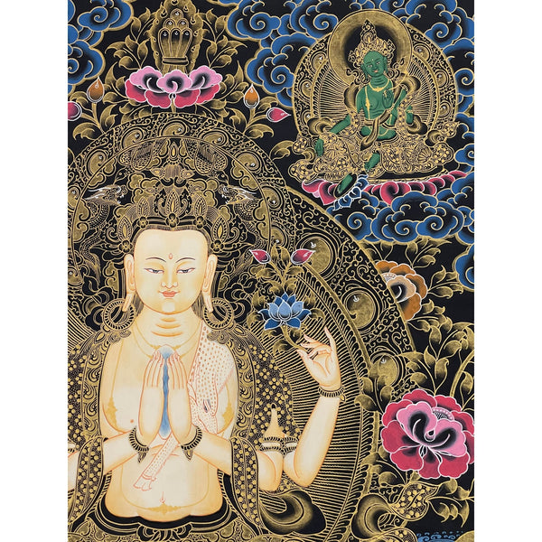 This 100% hand-drawn Chenrezig Thangka is an exquisite representation of the Bodhisattva of Compassion. Made in the Kathmandu Valley, Nepal, this Thangka not only serves as an elegant decoration but also brings profound spiritual energy to any space. It can be displayed as a focal point in your home or office or placed on your family altar for meditation, attracting the benevolent energy of Tibetan Buddhist art.