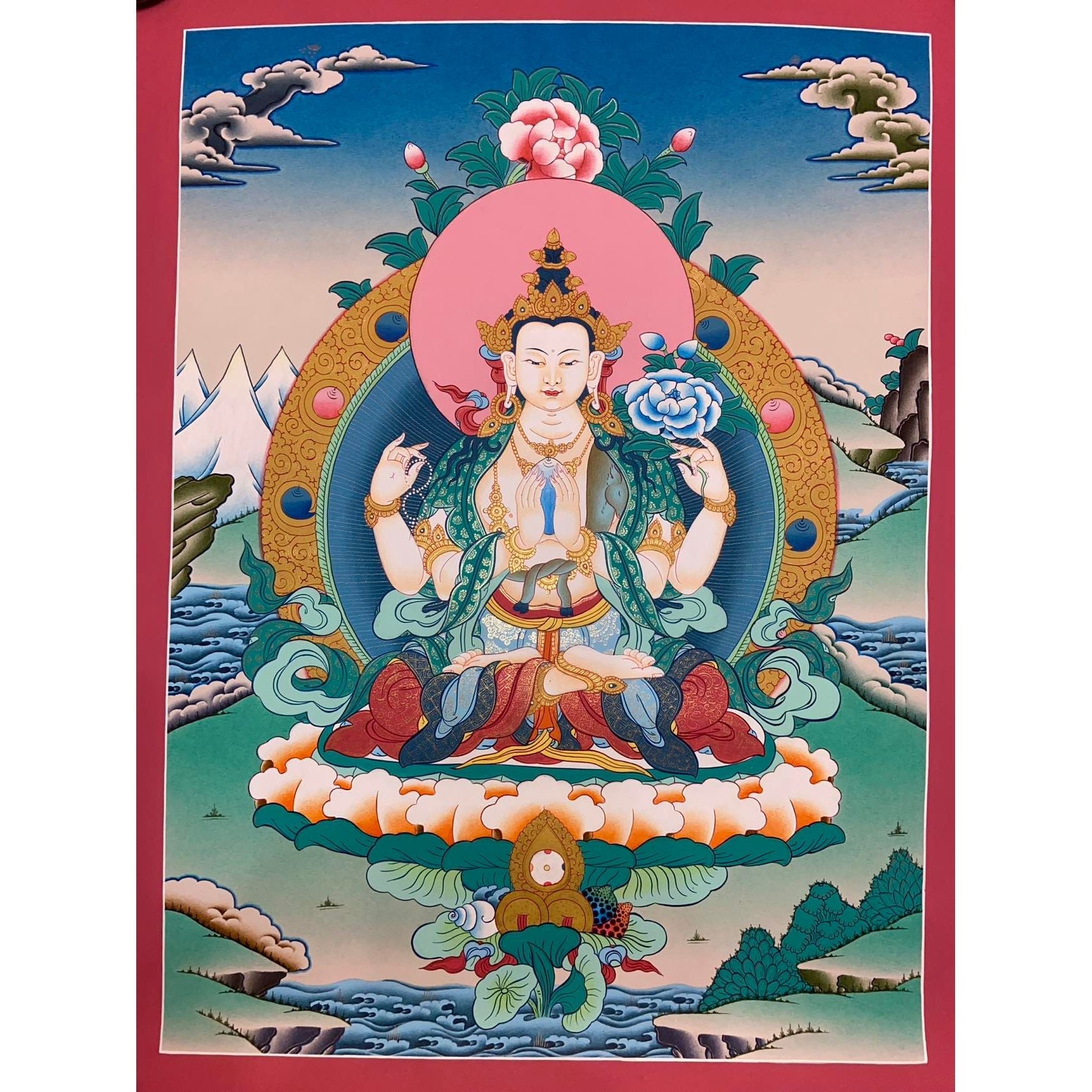About Chenrezig – The Bodhisattva of Compassion Chenrezig, also known as Avalokiteshvara, is one of the most revered deities in Mahayana Buddhism. As a bodhisattva, Chenrezig has achieved complete enlightenment but chooses to remain in the world, aiding all sentient beings in their path to liberation. His compassion is boundless, and he is often depicted with multiple arms, each holding a tool to assist in his mission of salvation.