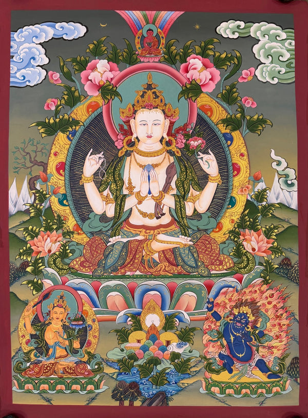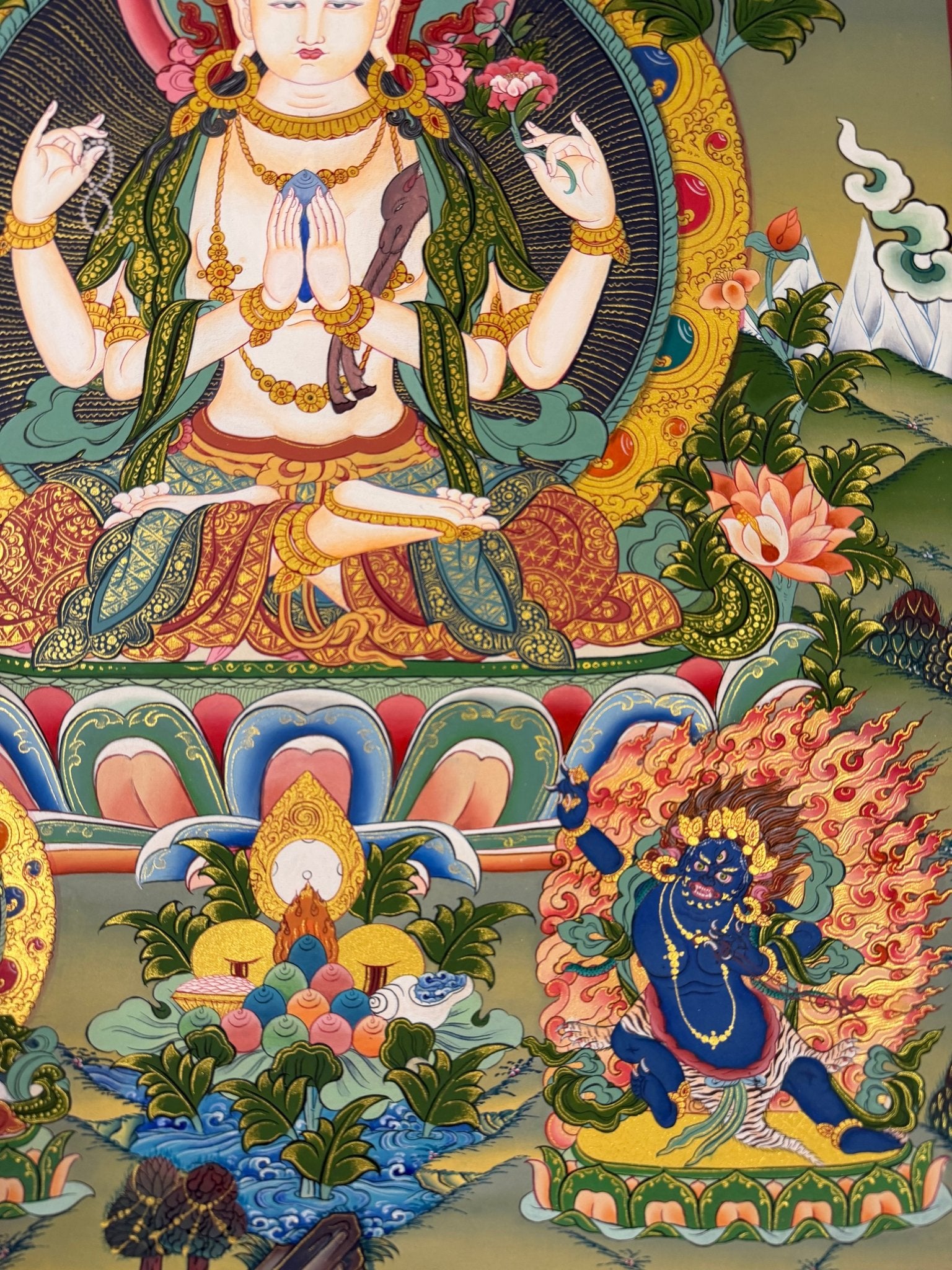 Symbol of Compassion: Chenrezig’s depiction emphasizes the boundless compassion for all living beings, offering a reminder to practice kindness and empathy.