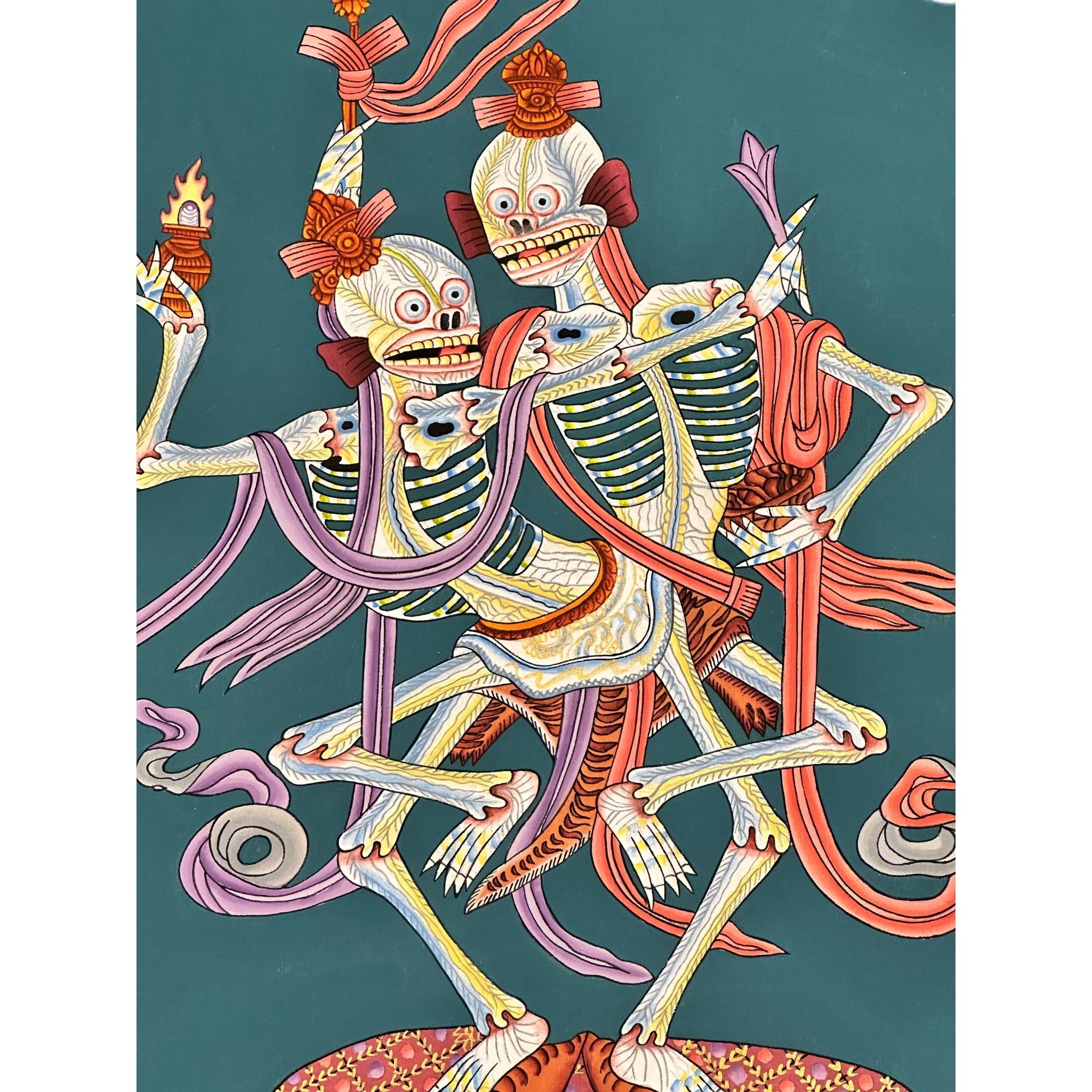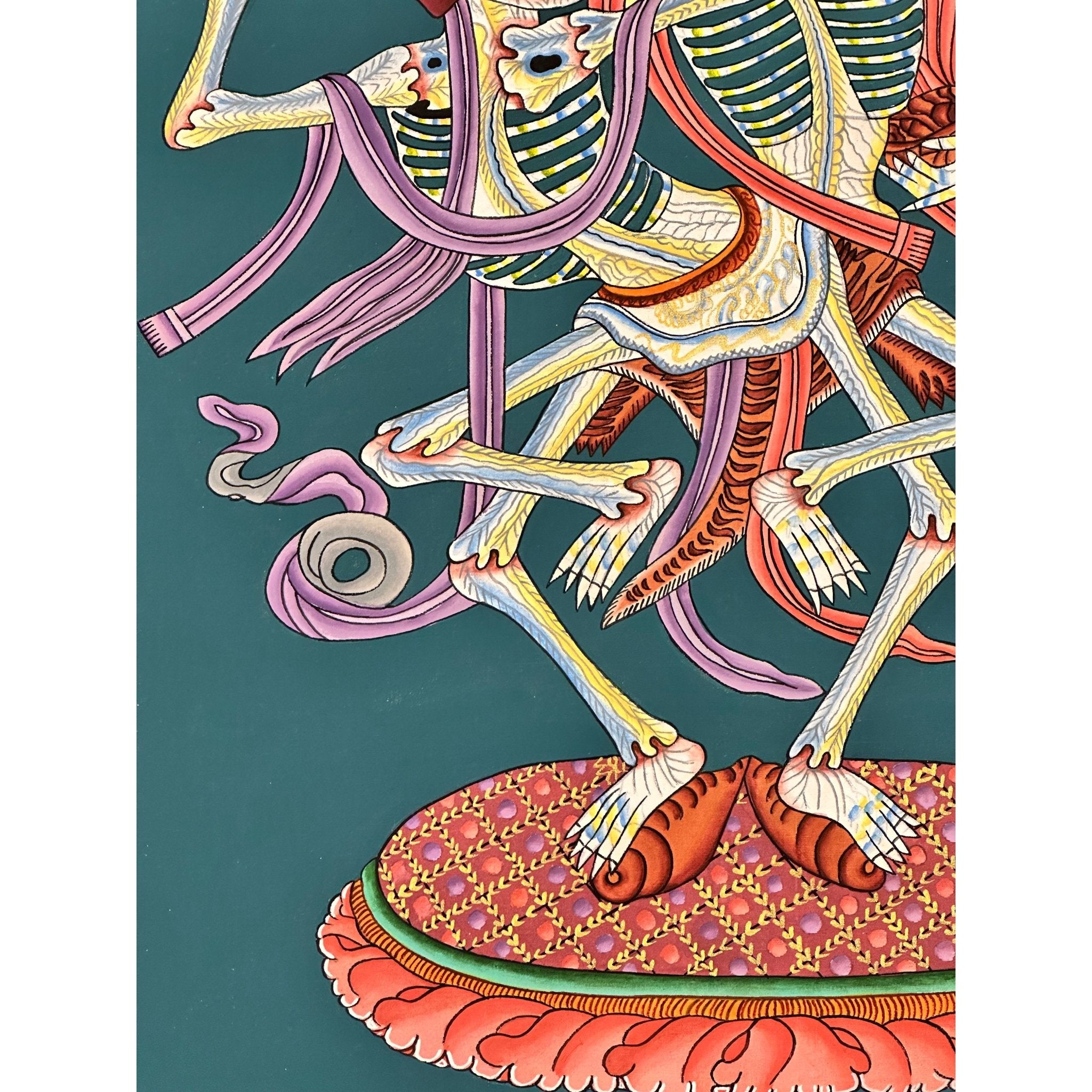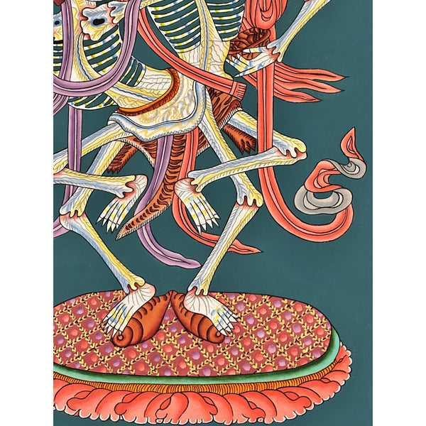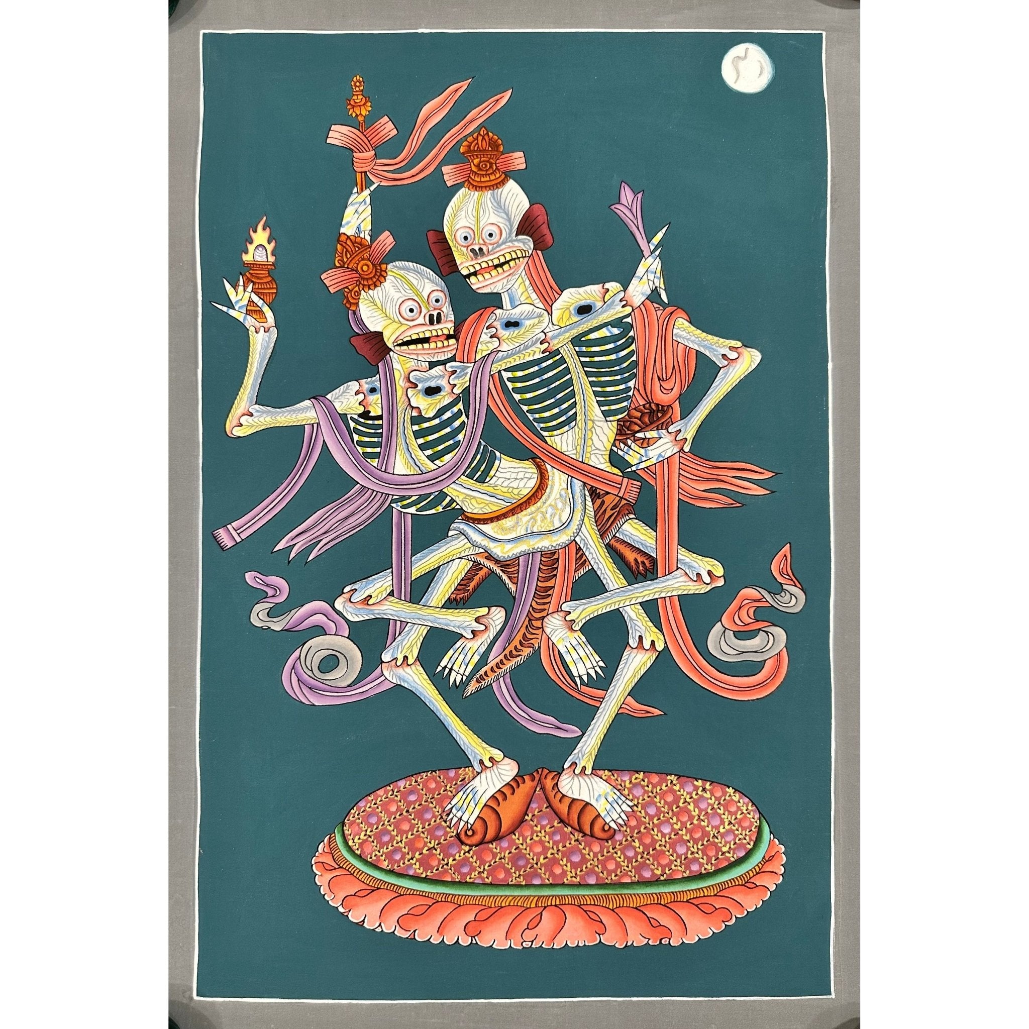 This 100% hand-drawn Citipati Thangka is an exceptional work of art, crafted with deep spiritual significance. Made in the Kathmandu Valley, Nepal, this Thangka can serve as an eye-catching addition to your home or office, offering both aesthetic appeal and spiritual energy. It can also be placed on your family altar for meditation, helping to foster spiritual growth, emotional healing, and attracting the benevolent energy of Tibetan Buddhist art.